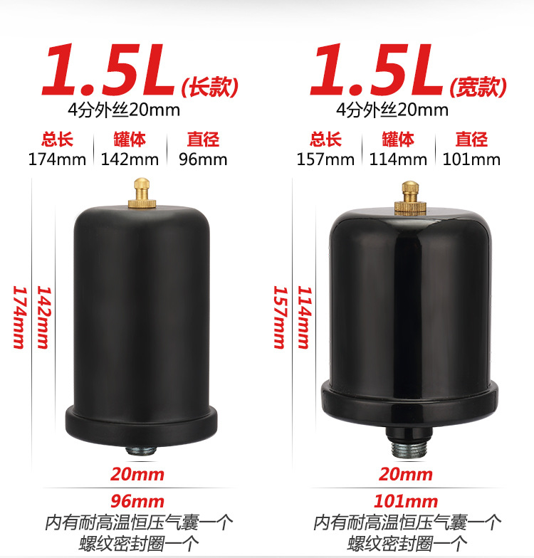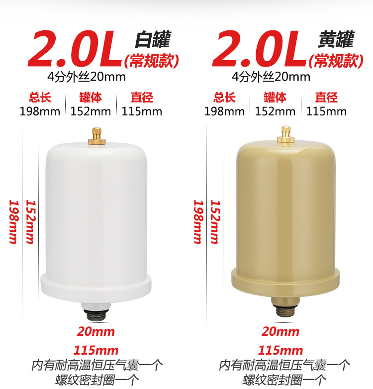 | Especificaciones | 1.5L de acero inoxidable tanque de presión 3 puntos de alambre exterior 15mm,1.5L de acero inoxidable tanque de presión 4 puntos de alambre exterior 20mm,2L plástico antioxidante de alta calidad tanque de presión 4 puntos recomendación de alambre exterior,Tanque de presión de acero inoxidable de gama media de 2L tipo convencional 4 puntos alambre exterior 20mm,Tanque de presión de acero inoxidable 2L convencional 4 puntos alambre exterior 20mm,2L tanque de presión negro regular 4 puntos alambre exterior 20mm,2L tanque de presión blanco regular 4 puntos alambre exterior 20mm,2L tanque de presión amarillo regular 4 puntos alambre exterior 20mm,Tanque de acero inoxidable grande de 2L 6 puntos alambre exterior 25mm tanque hueco,Tanque de presión de acero inoxidable 4L 6 puntos de alambre exterior 25mm tanque hueco,1.5L tanque de presión largo 4 puntos alambre exterior 20mm,5L vertical rojo 6 puntos alambre exterior 25mm,5L vertical rojo 1 pulgada alambre exterior 32mm,8L vertical rojo 6 puntos alambre exterior 25mm,8L vertical rojo 1 pulgada alambre exterior 32mm,12L vertical rojo 1 pulgada alambre exterior 32mm,Tanque de presión verde horizontal de 19L,24L tanque de presión verde horizontal,24L tanque de presión horizontal de acero inoxidable |
