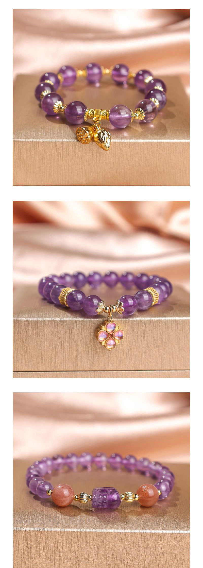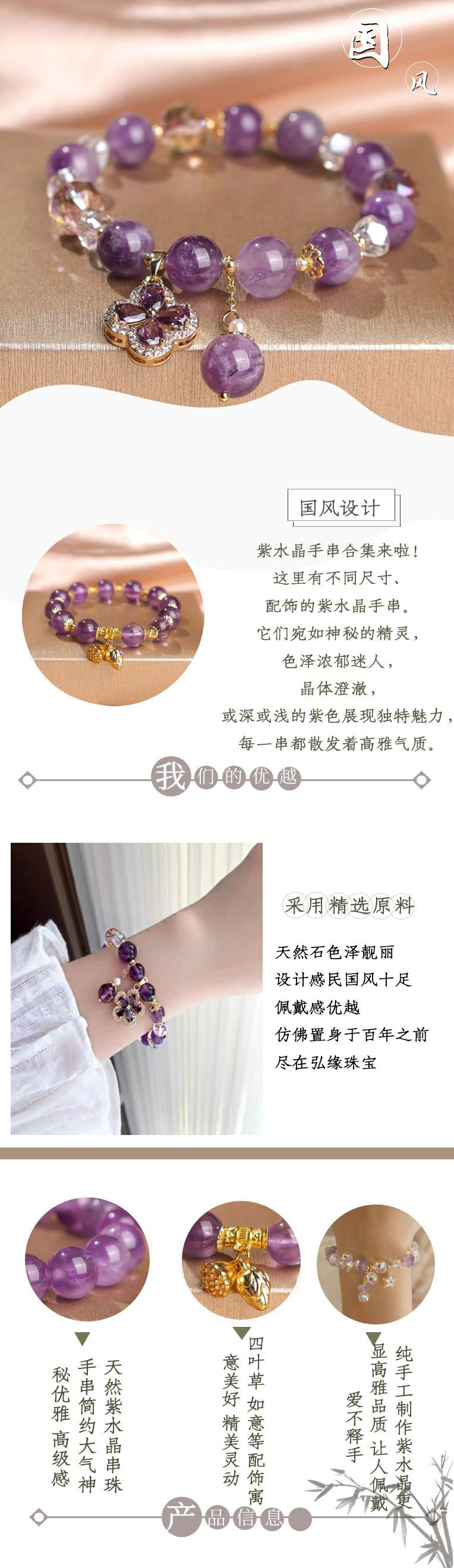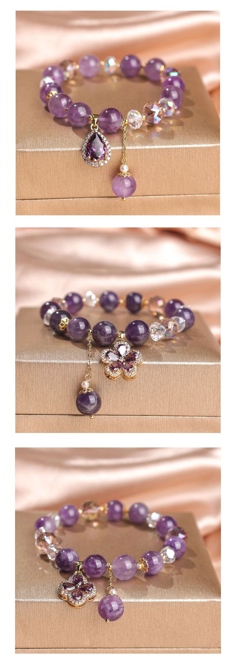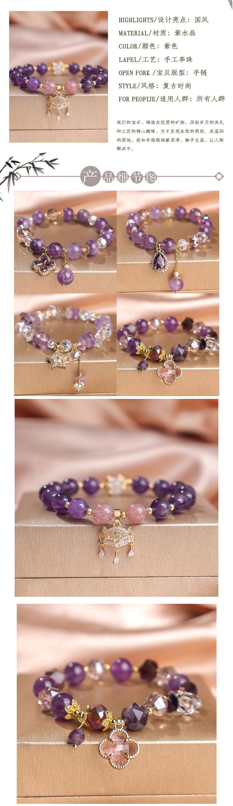 Pulseras de cuentas de amatista natural de alta calidad lujosa ligera para mujeres colgantes retro de cuatro hojas de alta calidad joyerías de comercio electrónico