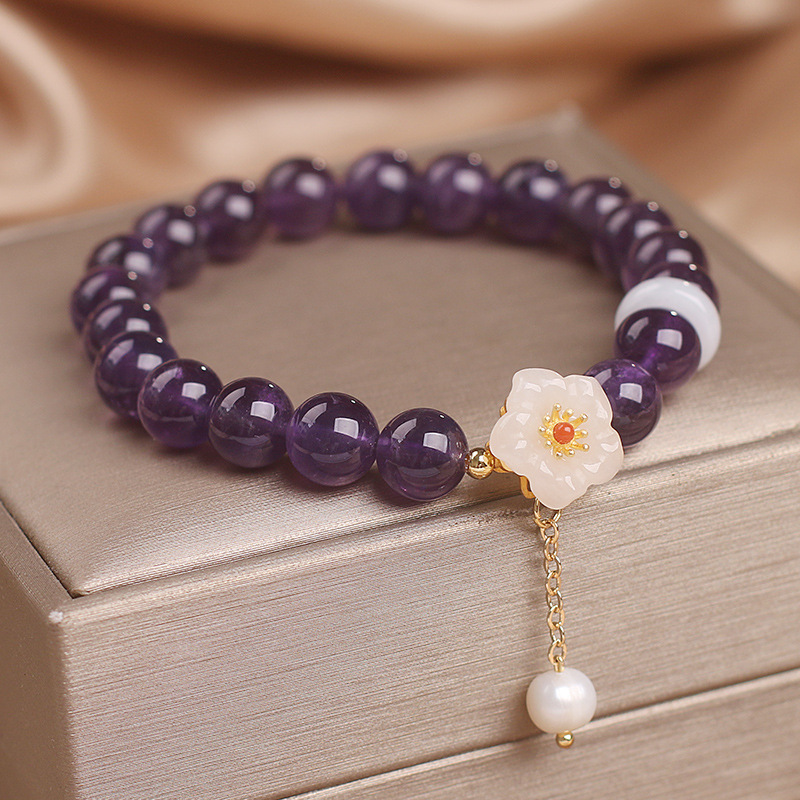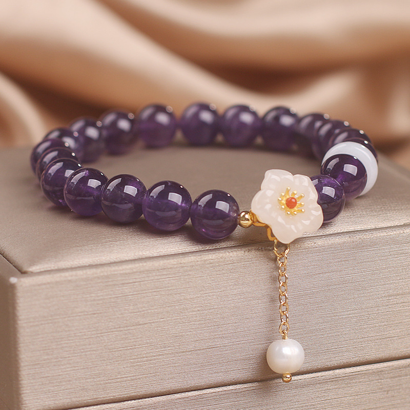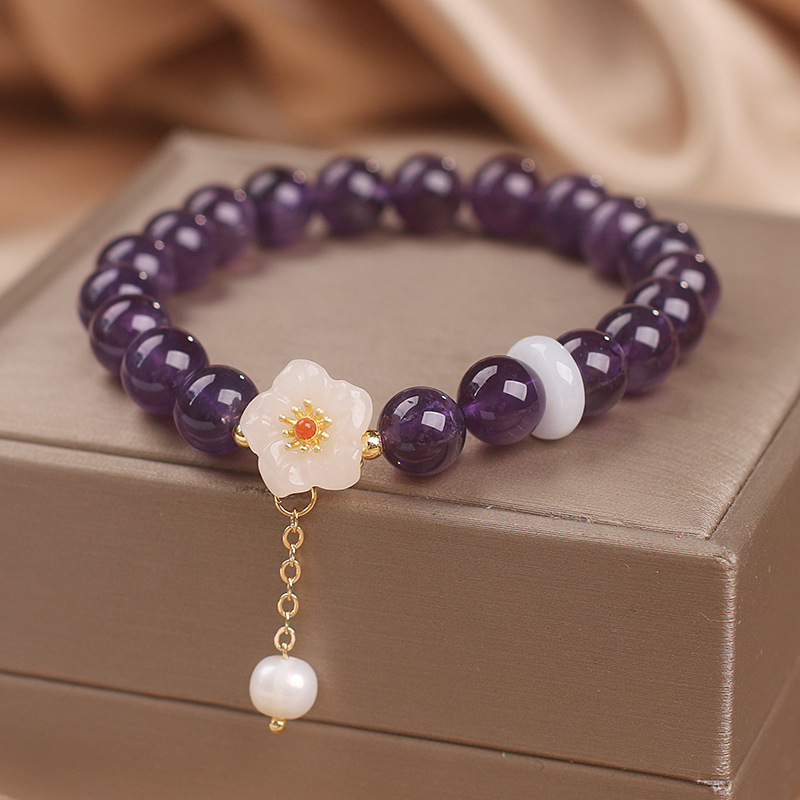 Estilo nacional dientes púrpura naturales pulsera de cristal negro pulsera de mujer pulsera de flores de jade blanco moda pulsera para regalar joyas de mano