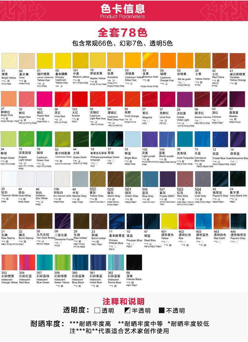 | Color | Amarillo básico de cadmio 02, amarillo de grano 53, Amarillo limón de cadmio 01, amarillo de cadmio oscuro 03, naranja de cadmio 04, rojo cadmio medio 06, rojo púrpura 07, azul común 10, azul ftalociano básico 11, Azul cobalto 12, azul cielo 13, verde británico ligero 15, verde cadmio 16, verde hierba 17, verde turquesa 18, amarillo napolio 19, amarillo tierra 20, ocre crudo 21, ocre 22, marrón maduro 23, negro marfil 24, blanco titanio 25, rosa 27, púrpura de cobalto ligero 28, marrón crudo 29, marrón Van Dyke 30, amarillo tierno 31, rojo brillante 32, azul brillante 33, verde brillante 34, naranja brillante 35, rojo brillante 37, rojo brillante verde brillante 38, blanco brillante 40, amarillo naranja veneciano 41, rojo tierra 42, verde tierra 44, gris Payne 45, blanco zinc 46, azul acero 47, gris medio 48, amarillo cobalto 49, amarillo chartler 52 |