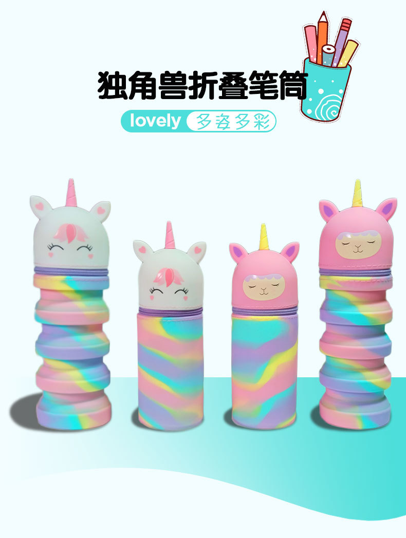 Animal encantador silicona de gran capacidad retráctil bolígrafo de cremallera bolsas de bolígrafo de papelería unicornio cilíndrico niños