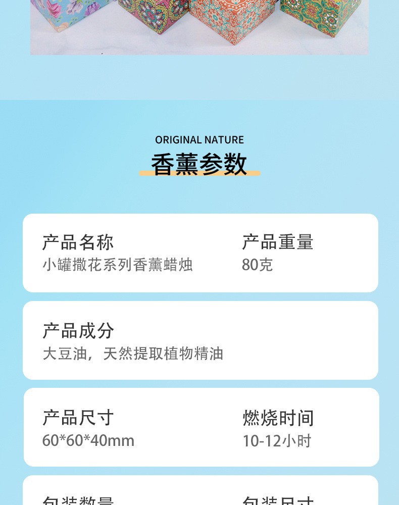 | Tipo fragante | Jasmine d210, lavanda d40, París invertido d33, higos d209, Violet d205, limón d39, rosa d41, vainilla d206, cacao d46, Gardenia Paradise d207, peonía d7, camelia d211, naranja de sangre taroko de wolfberry d204, Caqui japonés d201, campana de viento azul d203, pera británica D200 y pequeña canglan, menta d202, manzanilla d212, cuatro cajas de regalo sin velas, citronela d208, incienso tardío d213, menta d202 - con una sola caja de color, jazmín d210 - con una sola caja de color, lavanda D40 - con una sola caja de color, París invertido d33 - con una sola caja de color, higos d209 - con una sola caja de color, Violet d205 - con una sola caja de color, limón d39 - con una sola caja de color, rosa D41 - con una sola caja de color, vainilla d206 - con una sola caja de color, d46 - cacao, d207 Gardenia Paradise - con una sola caja de color, peonía D7 - con una sola caja de color, Camelia de montaña d211 - con una sola caja de color, naranja de sangre taroko de wolfberry d204 - con una sola caja de color, caqui japonés d201 - con una sola caja de color, campana de viento azul d203 - con una sola caja de color, pera británica D200 y pequeña canglan - con una sola caja de color, manzanilla d212 - con una sola caja de color, xiangmao d208 - con una sola caja de color, XiangYu de noche d213 - con una sola caja de color |