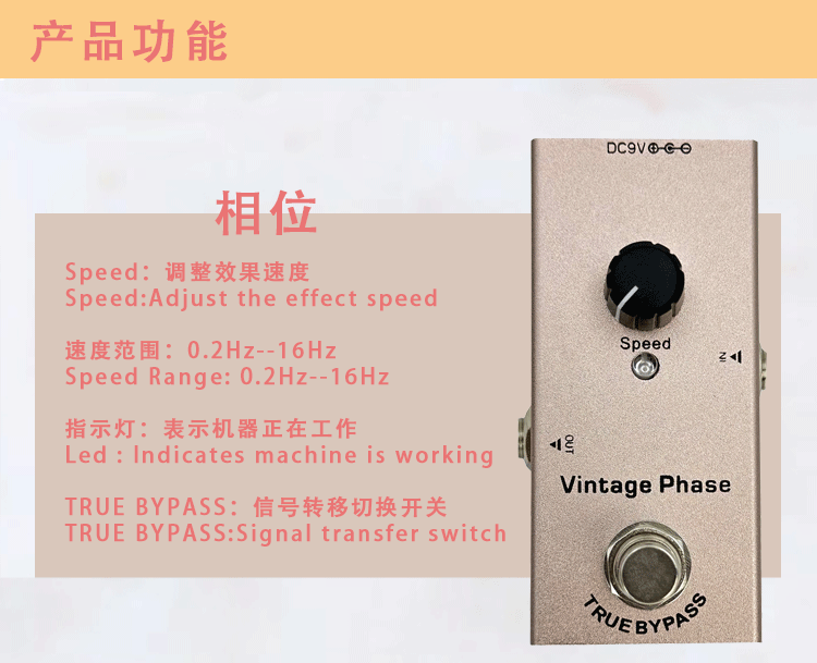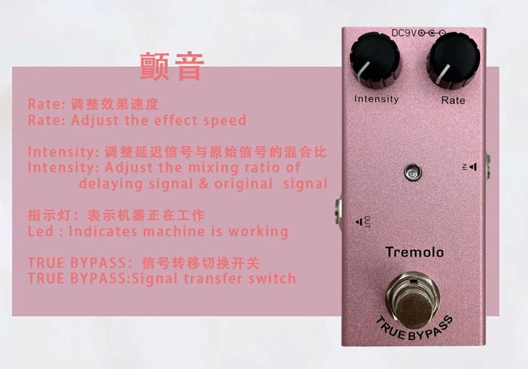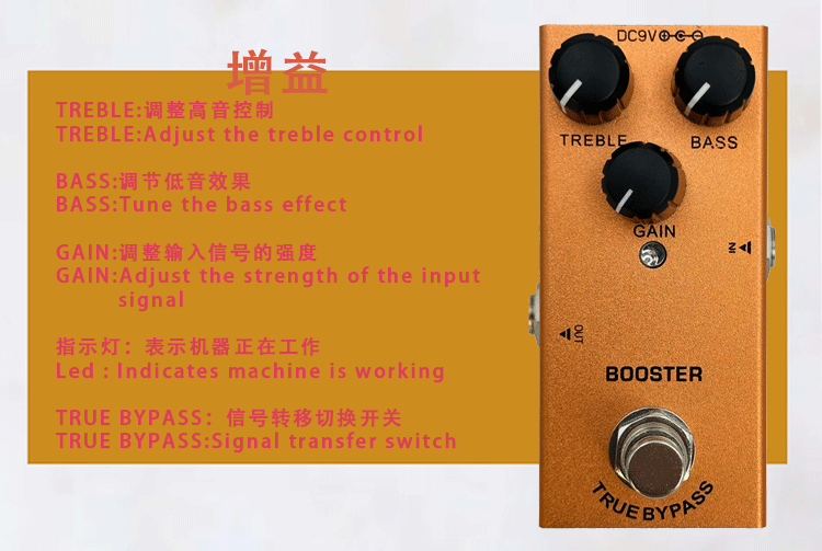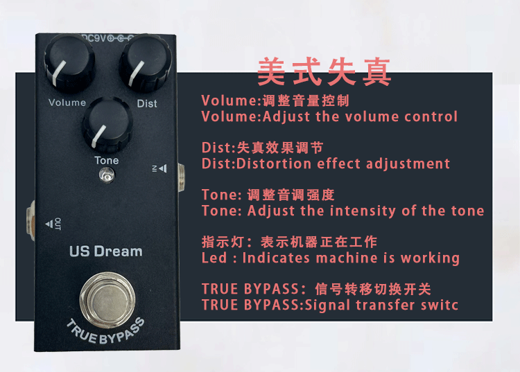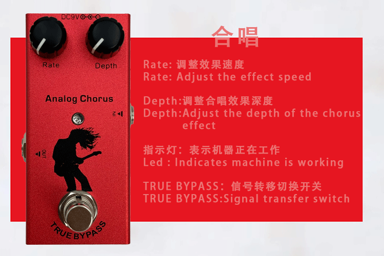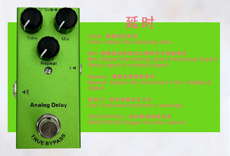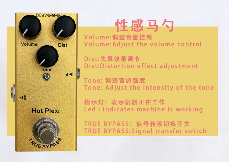 | Color | Distorsión británica, distorsión estadounidense, cuchara sensual, retraso, ganancia, coro, sobrecarga, trémolo, reducción de ruido, fase |