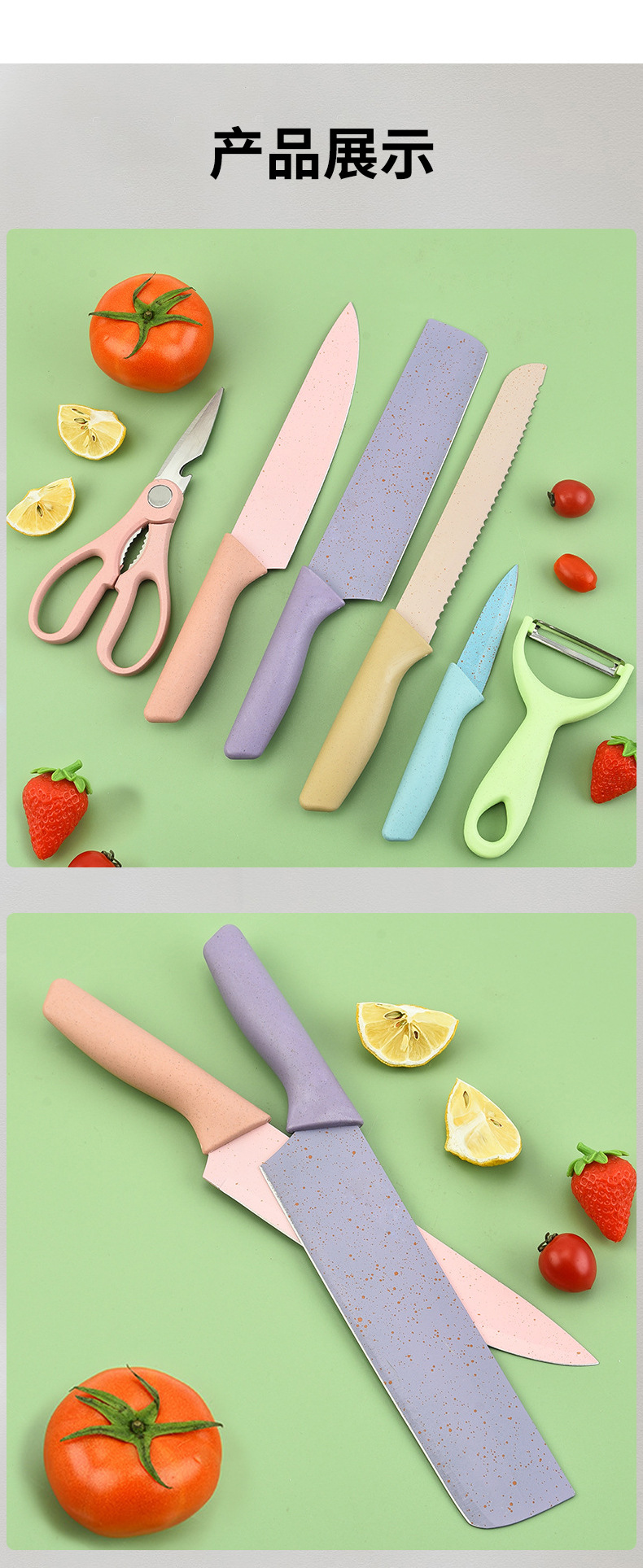 Juego de cuchillos de seis piezas de paja de trigo de color macaron, cocina para el hogar, cuchillo de cocina, corte de carne, caja de regalo de acero inoxidable, juego de cuchillos
