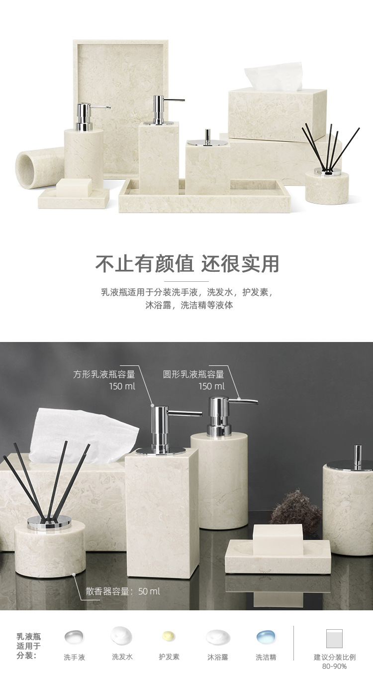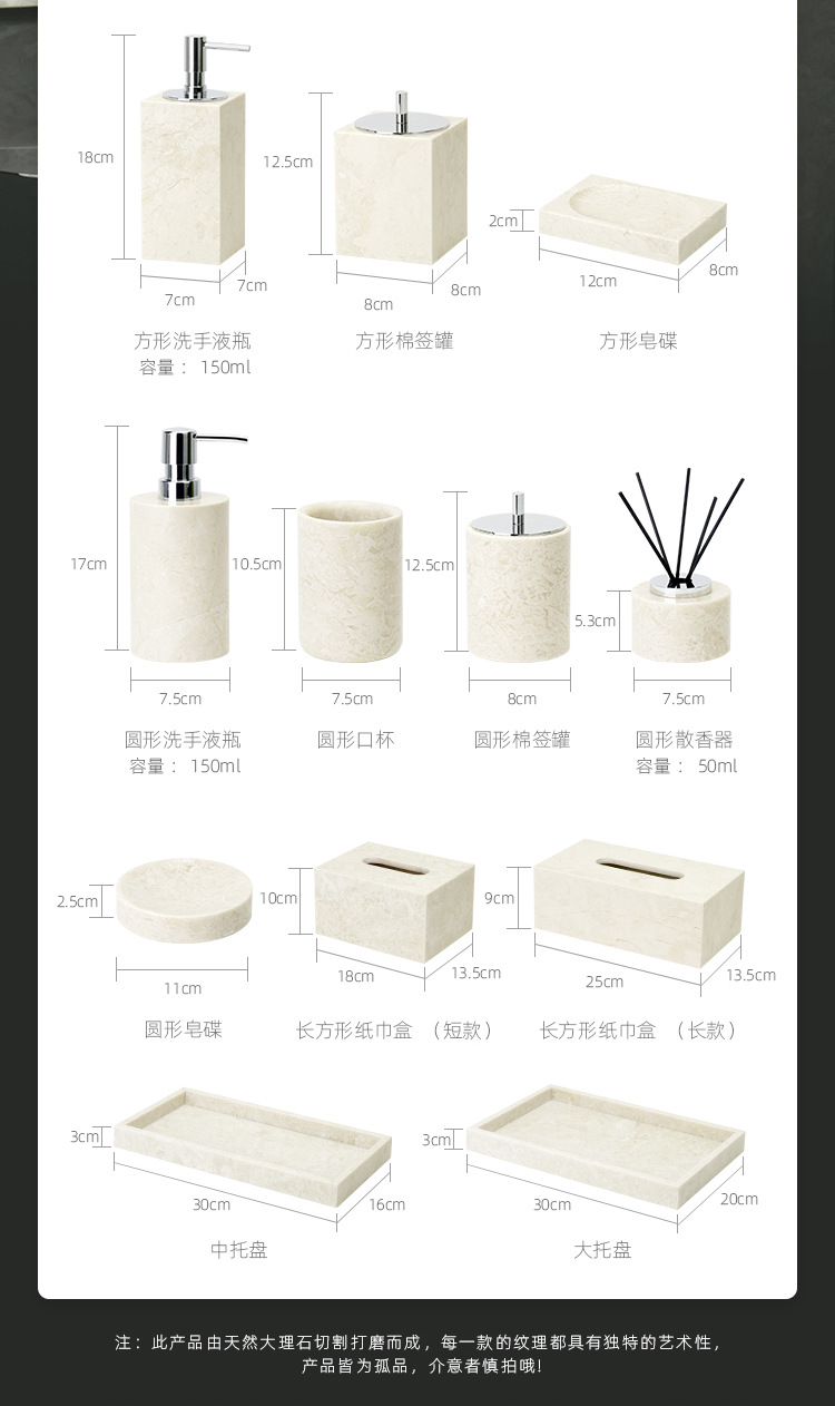 | Especificaciones | Botellas redondas de emulsión (pequeñas cabezas redondas), botellas redondas de emulsión (grandes cabezas redondas), botellas redondas de emulsión (pequeñas cabezas redondas de acero inoxidable), latas redondas de hisopo de algodón, botellas redondas de aromaterapia, botellas cuadradas de emulsión, latas cuadradas de hisopo de algodón, botellas cuadradas de aromaterapia, estantes de cepillo de dientes de tres agujeros, platos rectangulares de jabón, paletas elípticas, paletas rectangulares grandes, cajas rectangulares de toallas de papel (cortas), cajas rectangulares de toallas de papel (largas), cepillos de inodoro cuadrados, paletas elípticas 3 juegos de paletas elípticas 3 juegos b, paletas elípticas 4 juegos de paletas medianas a, paletas medianas 4 juegos de paletas medianas d, paletas grandes, paletas medianas 4 juegos de paletas grandes, a 4 juegos de bandeja grande b, 6 juegos de bandeja grande a, 6 juegos de bandeja grande b, 6 juegos de bandeja grande C y 7 juegos de bandeja grande a |