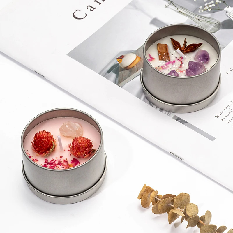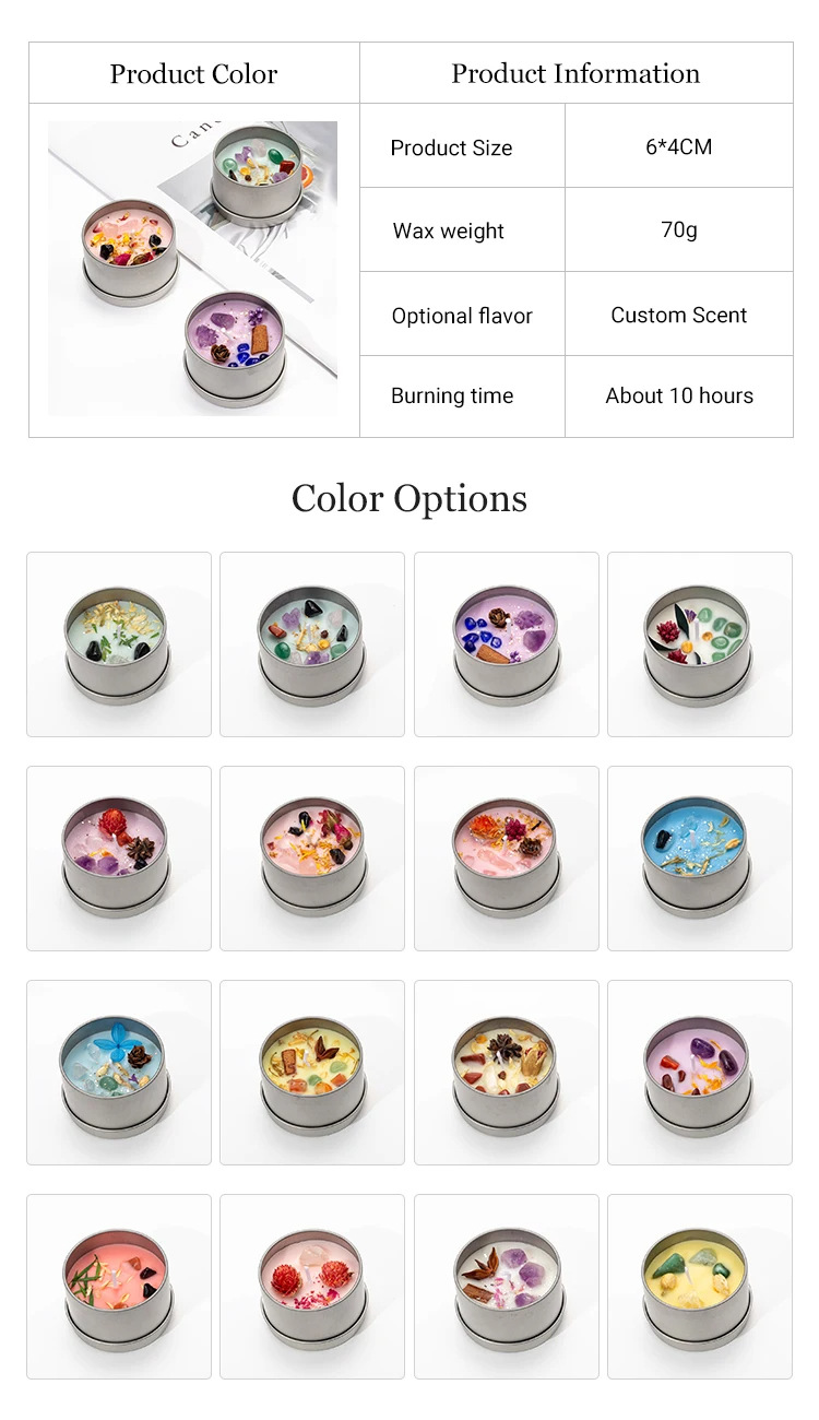 Flores secas de cristal, velas aromáticas coloridas, comercio electrónico transfronterizo, latas, fragancia, cera de soja, cristales de piedra natural hechos a mano