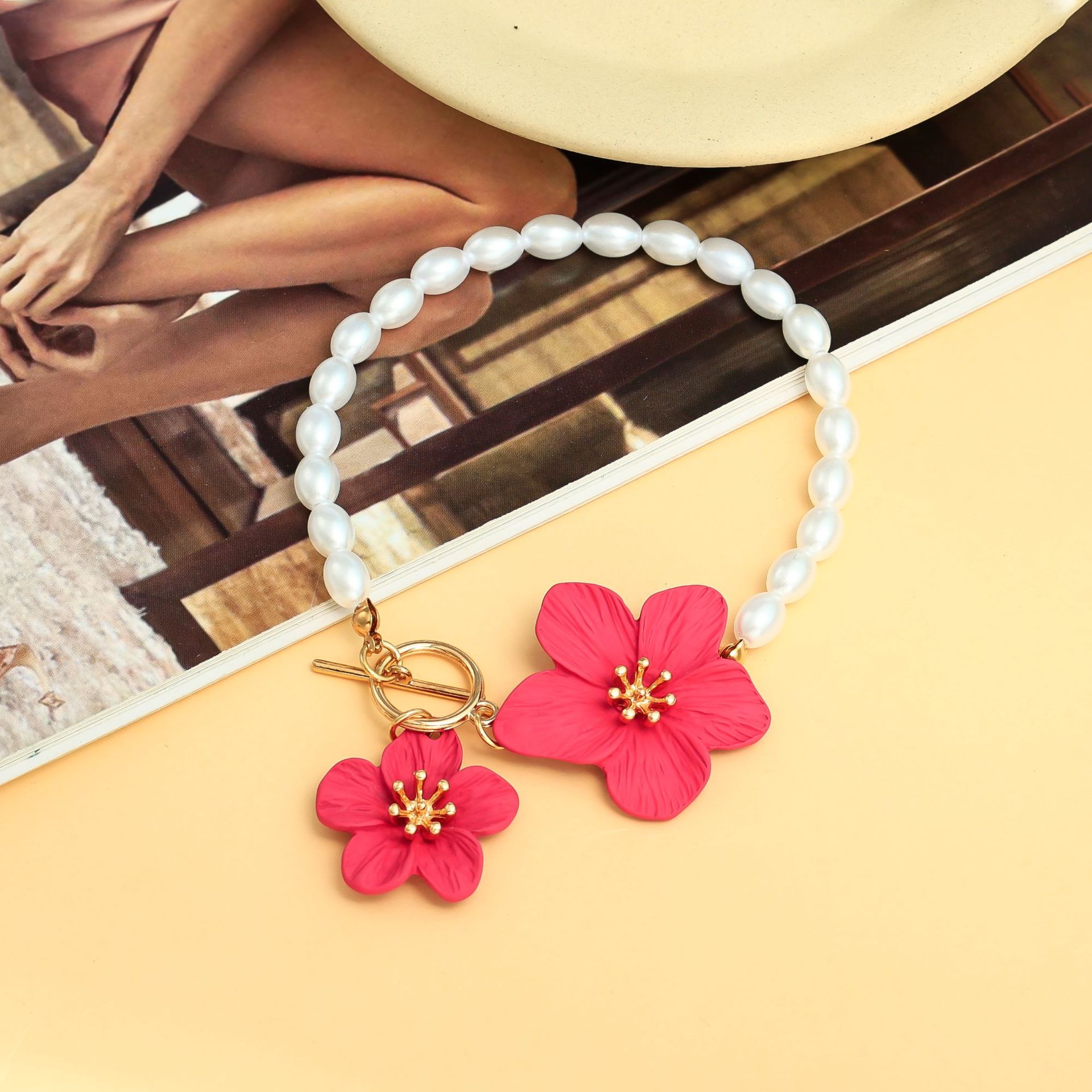 Comercio exterior transfronterizo nuevo estilo bohemio luz lujo perla elegante flor tobillera pintura en aerosol cadena de OT tridimensional tobillera