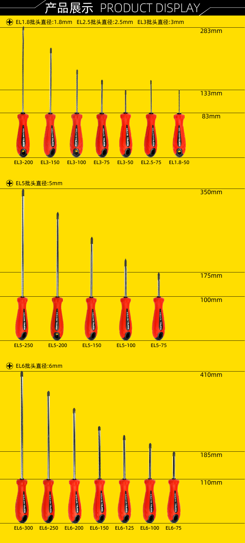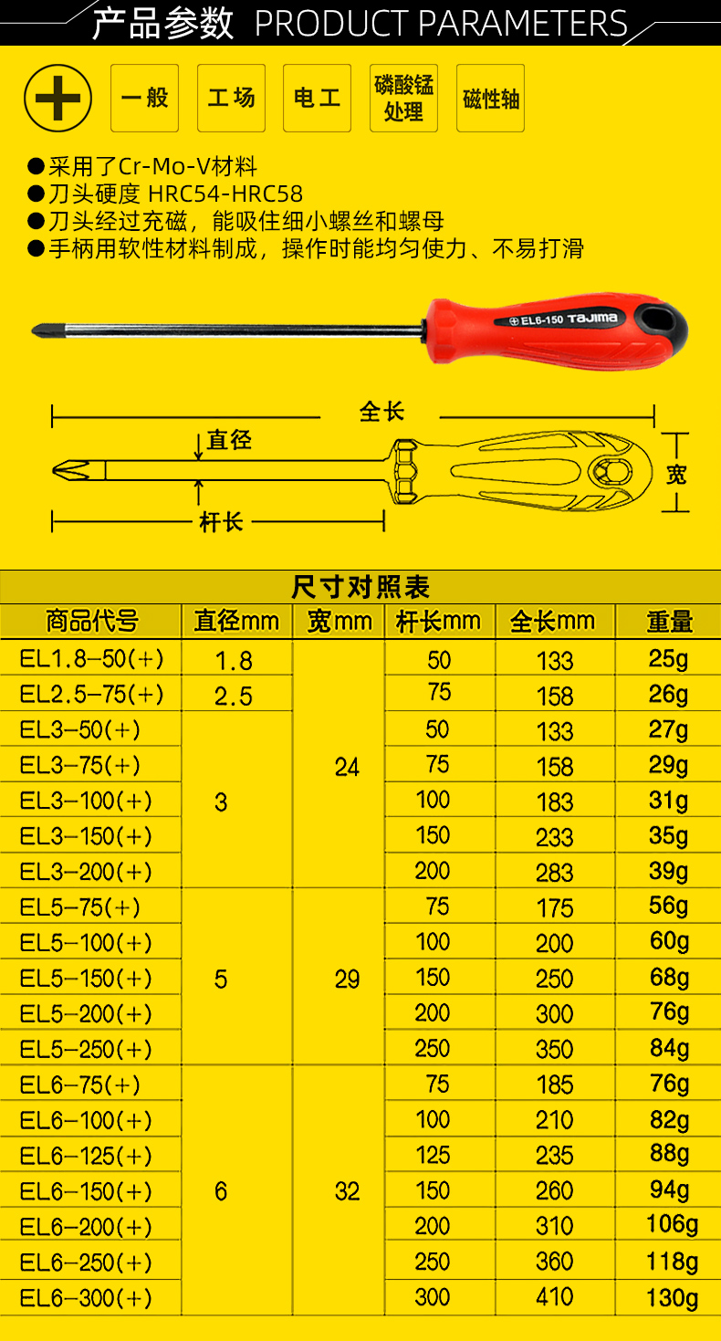 | Especificaciones y modelos | 1,8 × 50 mm [longitud total 133mm], 2,5 × 75 mm [longitud total 158mm], 3 × 50 mm [longitud total 133mm], 3 × 75 mm [longitud total 158mm], 3 × 100 mm [longitud total 183mm], 3 × 150 mm [longitud total 233 mm], 3 × 200 mm [longitud total 283 mm], 5 × 100 mm [longitud total 175mm], 5 × 150 mm [longitud total 250mm], 5 × 200 mm [longitud total 300mm], 5 × 250 mm [longitud total] y 6 × 750mm [longitud total 1856 mm] longitud total 210mm], 6 × 125 mm [longitud total 235 mm], 6 × 150 mm [longitud total 260 mm], 6 × 200 mm [longitud total 310mm], 6 × 250 mm [longitud total 360 mm], 6 × 300 mm [longitud total 410 mm], manga de pinzas de destornillador de desmontaje rápido |