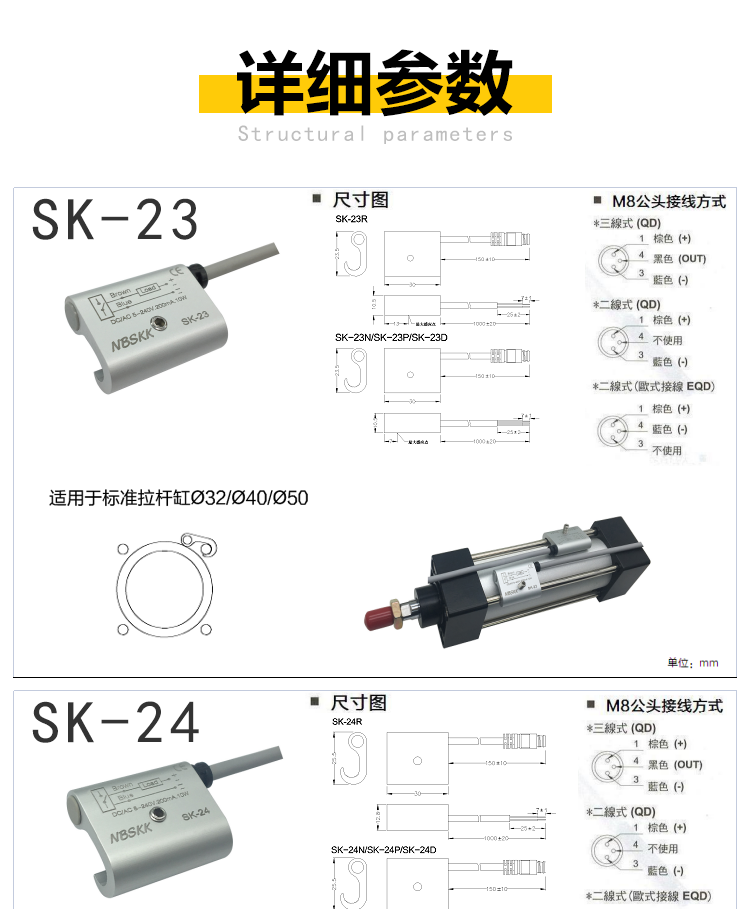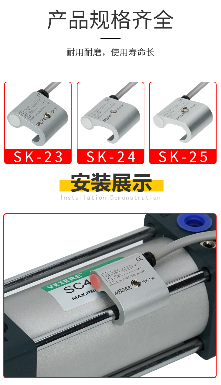 | Especificaciones y modelos | SK - 23 (32 - 50), SK - 23 (32 - 50), línea de 3 metros, SK - 24 (63), SK - 25 (80 - 100), SK - 51 (125), SK - 55 (250), SK - 58 (160 - 200), RMS - A1 (32 - 50), RMS - A2 (63), RMS - A3 (80 - 100), sk23 - NPN (32 - 50), SK - 24 - NPN (63), SK - 25 - NPN (80 - 100), SK - 51 - NPN (125), SK - 125 55 - NPN (diámetro del cilindro 250), SK - 58 - NPN (diámetro del cilindro 160 - 200), SK - 23 - PNP (diámetro del cilindro 32 - 50), SK - 24 - PNP (diámetro del cilindro 63), SK - 25 - PNP (diámetro del cilindro 80 - 100), SK - 51 - PNP (diámetro del cilindro 125), SK - 55 - PNP (diámetro del cilindro 250), SK - 58 - PNP (diámetro del cilindro 160 - 200), SK - 23b (diámetro del cilindro 32 - 50), SK - 24b (diámetro del cilindro 63), SK - 25b (diámetro del cilindro 80 - 100), SK - 23d (diámetro del cilindro 32 - 50), SK - 50- 24d (diámetro del cilindro 63) electrónico, SK - 25d (diámetro del cilindro 80 - 100) electrónico |
