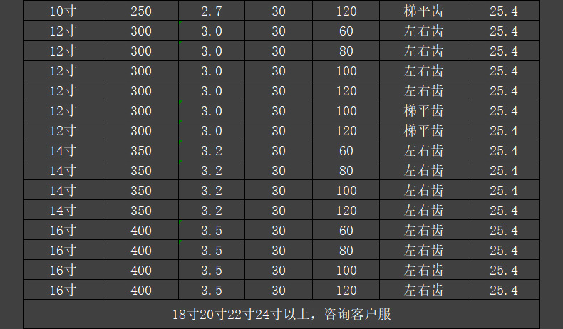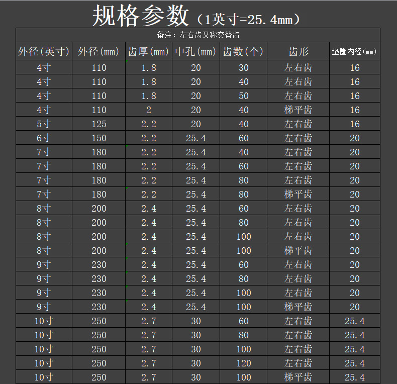 | Modelo | Diente X30 de 4 pulgadas X110mmX1.8X20 Diente alterno de orificio,Diente X40 de 4 pulgadas X110mmX1.8X20 Diente alterno de orificio,Diente X50 de 4 pulgadas X110mmX1.8X20 Diente alterno de orificio,Diente de 4 pulgadas X40 X110mmX1. 8x20 agujero escalera dientes planos,Diente X40 de 5 pulgadas X125mmX2.0X20 Diente alterno de orificio,5 pulgadas X40 dientes X125mmX2.0X20 agujeros escalera dientes planos,Dientes de 6 pulgadas X60 X150mmx 2.0X25.4 agujeros dientes alternos,Diente X40 de 7 pulgadas X180mmx 2.2X25.4 agujero dientes alternos,Diente X60 de 7 pulgadas X180mmx 2.2X25.4 agujero dientes alternos,Diente X80 de 7 pulgadas X180mmx 2.2X25.4 agujero dientes alternos,Diente X80 de 7 pulgadas X180mmX2.0X25.4 agujero escalera dientes planos,Diente X60 de 8 pulgadas X200mmx 2.4X25.4 agujero dientes alternos,Dientes X80 de 8 pulgadas X200mmx 2.4X25.4 agujeros dientes alternos,Dientes X100 de 8 pulgadas X200mmx 2.4X25.4 agujeros dientes alternos,Diente X80 de 8 pulgadas X200mmx 2.0X25.4 agujero escalera dientes planos,8 pulgadas X100 dientes X200mmx 2.0X25.4 agujeros escalera dientes planos,Diente X60 de 9 pulgadas X230mmx 2.4X25.4 agujero dientes alternos,Diente X80 de 9 pulgadas X230mmx 2.4X25.4 agujero dientes alternos,Diente X100 de 9 pulgadas X230mmx 2.4X25.4 agujero dientes alternos,Diente X80 de 9 pulgadas X230mmX2.0X25.4 agujero escalera dientes planos,9 pulgadas X100 dientes X230mmx 2.0X25.4 agujeros escalera dientes planos,10 pulgadas X40 dientes X250mmx 2.7X25.4 agujeros dientes alternos,10 pulgadas X60 dientes X250mmx 2.7X25.4 agujeros dientes alternos,10 pulgadas X80 dientes X250mmx 2.7X25.4 agujeros dientes alternos,Diente X100 de 10 pulgadas X250mmx 2.7X25.4 agujeros dientes alternos,10 pulgadas X120 dientes X250mmx 2.7X25.4 agujeros dientes alternos,10 pulgadas X100 dientes X255mmx 2.0X25.4 agujeros escalera dientes planos,10 pulgadas X120 dientes X255mmx 2.0X25.4 agujeros escalera dientes planos,Diente de 12 pulgadas X60 X300mmx 3.0X30 Diente alterno de orificio,Diente X80 de 12 pulgadas X300mmx 3.0X30 Diente alterno de orificio,Diente X100 de 12 pulgadas X300mmx 3.0X30 Diente alterno de orificio,Diente de 12 pulgadas X120 X300mmx 3.0X30 Diente alterno de orificio,Diente X60 de 14 pulgadas X350mmx 3.2X30 Diente alterno de orificio,Diente X80 de 14 pulgadas X350mmx 3.2X30 Diente alterno de orificio,Diente X100 de 14 pulgadas X350mmx 3.2X30 Diente alterno de orificio,Diente X120 de 14 pulgadas X350mmx 3.2X30 Diente alterno de orificio,Diente X60 de 16 pulgadas X400mmx 3.5X30 Diente alterno de orificio,Diente X80 de 16 pulgadas X400mmx 3.5X30 Diente alterno de orificio,Diente X100 de 16 pulgadas X400mmx 3.5X30 Diente alterno de orificio,Diente X120 de 16 pulgadas X400mmx 3.5X30 Diente alterno de orificio |