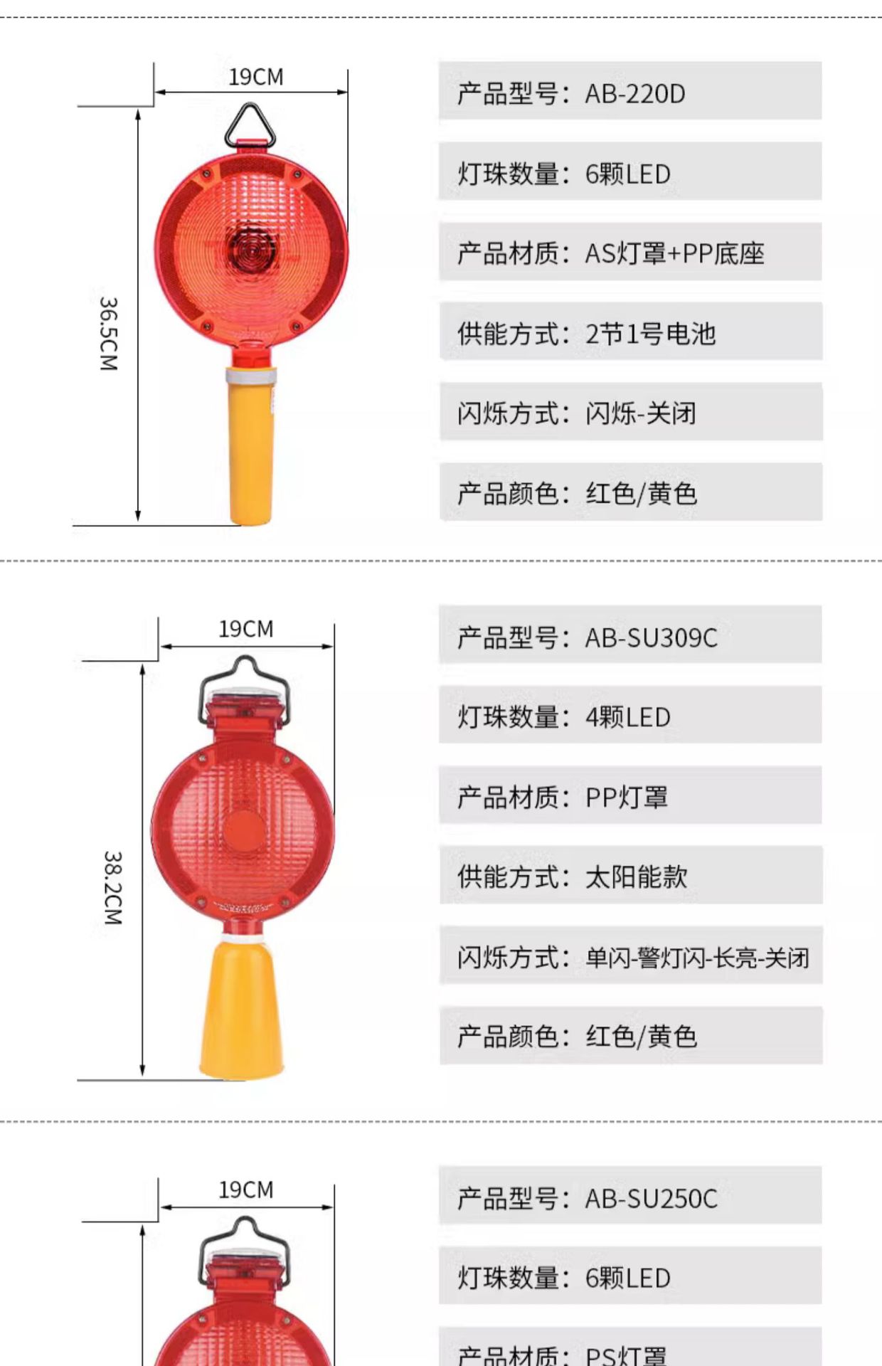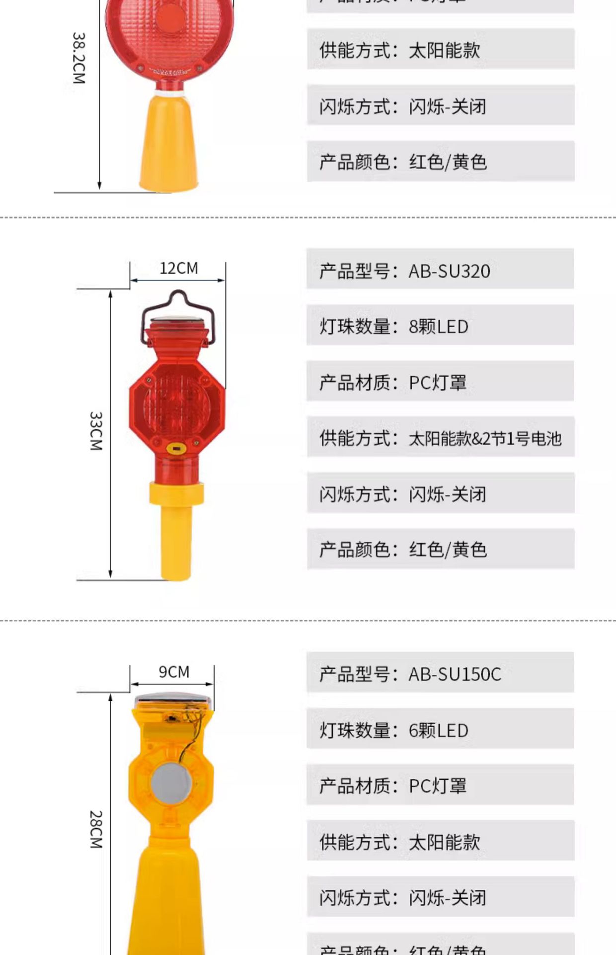 | Modelo | Envío de AB-SU320 (rojo/batería solar) sin batería,Envío de AB-SU320 (amarillo/batería solar) sin batería,AB-SU150C (rojo/solar),AB-SU150C (amarillo/solar),AB-SU250C (rojo/solar),AB-SU250C (amarillo/solar),AB-SU309C (rojo/solar),AB-SU309C (amarillo/solar),AB-265 (rojo/batería) envío sin batería,AB-265 (amarillo/batería) envío sin batería,AB-305 (rojo/batería) envío sin batería,AB-305 (amarillo/batería) envío sin batería,Envío de AB-220D (rojo/batería) sin batería,Envío de AB-220D (amarillo/batería) sin batería,Luz de techo de cono de carretera,La entrega de la tarjeta de suspensión de la batería no incluye la batería,Batería de envío de marca lenta sin batería,Carga tarjeta de suspensión,Tarjeta de carga lenta |