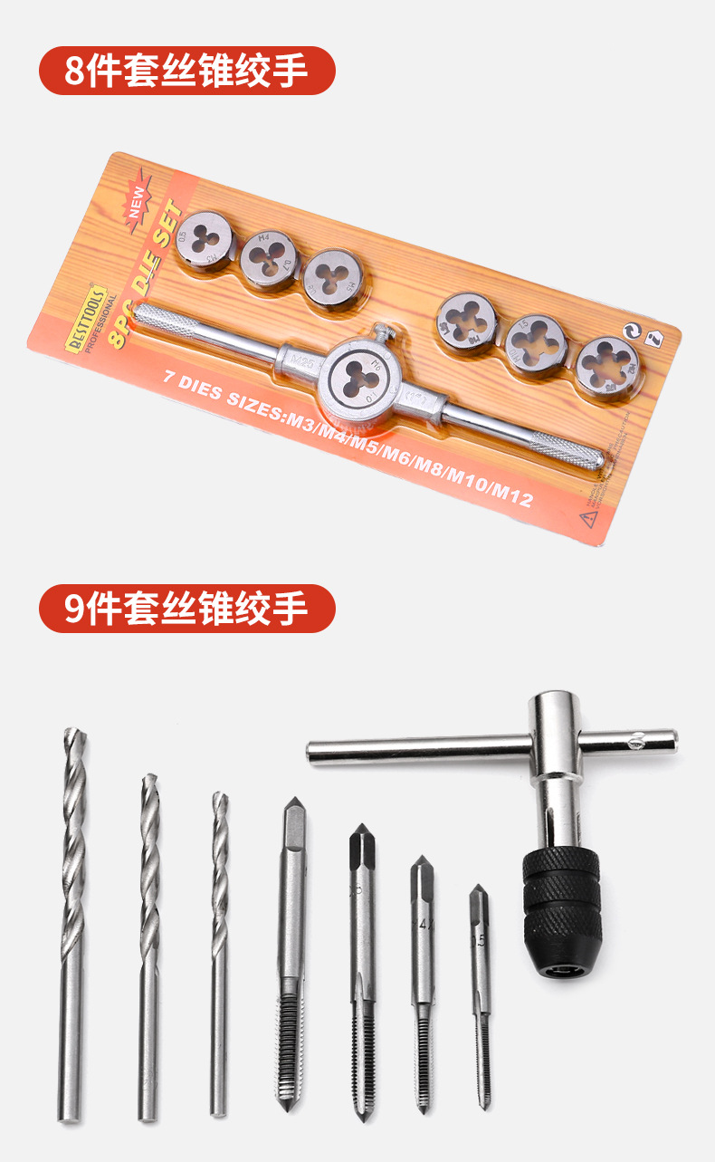 | Modelo | [Juego de 12 piezas] Juego de combinación de tornos de placa de roscado manual,[Juego de 20 piezas] Juego de combinación de tornos de placa de roscado manual,[Juego de 40 piezas] Juego de combinación de tornos de placa de roscado manual,[Juego de 6 piezas] Juego de combinación de tornos de grifo manual,[Juego de 9 piezas] Juego de combinación de taladro de tornillo manual,[Juego de 8 piezas] Juego de combinación de tornos de placa manual |