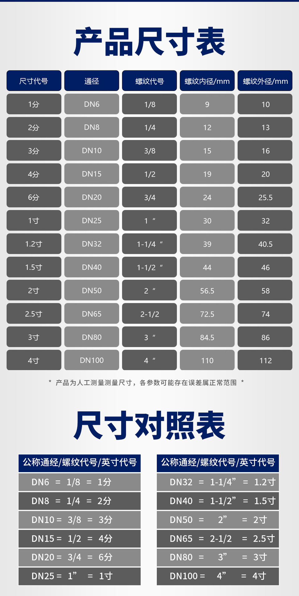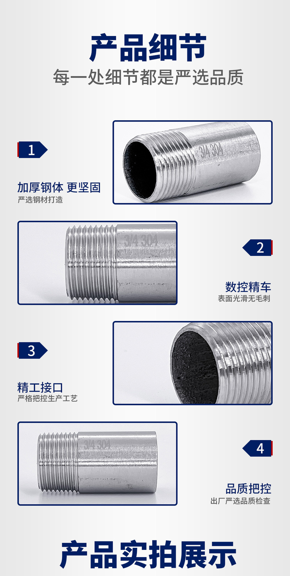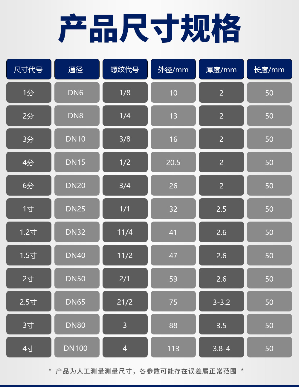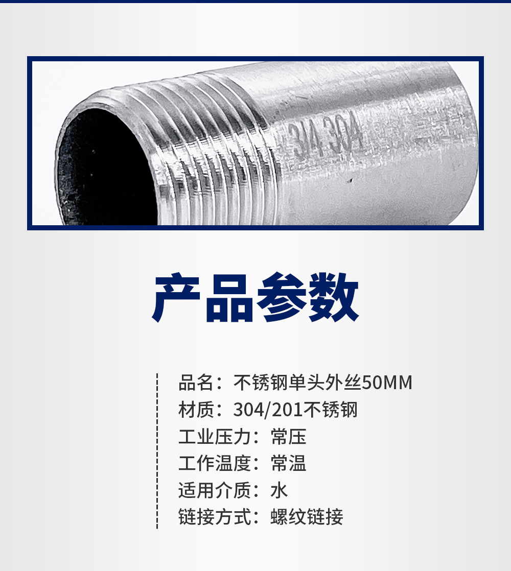 | Departamento | 304 material 2 puntos = dn8 * 50mm,304 material 3 puntos = dn10 * 50mm,304 material 4 puntos = dn15 * 50mm,304 material 6 puntos = dn20 * 50mm,304 material 1 pulgada = dn25 * 50mm,304 material 1.2 pulgadas = dn32 * 50mm,304 material 1.5 pulgadas = dn40 * 50mm,304 material 2 pulgadas = dn50 * 50mm,201 material 2 puntos = dn8 * 50mm,201 material 3 puntos = dn10 * 50mm,201 material 4 puntos = dn15 * 50mm,201 material 6 puntos = dn20 * 50mm,201 material 1 pulgada = dn25 * 50mm,201 material 1.2 pulgadas = dn32 * 50mm,201 material 1.5 pulgadas = dn40 * 50mm,201 material 2 pulgadas = dn50 * 50mm |