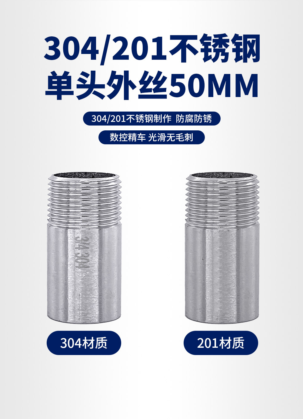 Tubo de alambre de una sola cabeza de acero inoxidable 304 Tubo redondo Diente exterior 50mm Tubo de agua con rosca extendida Junta de soldadura extendida