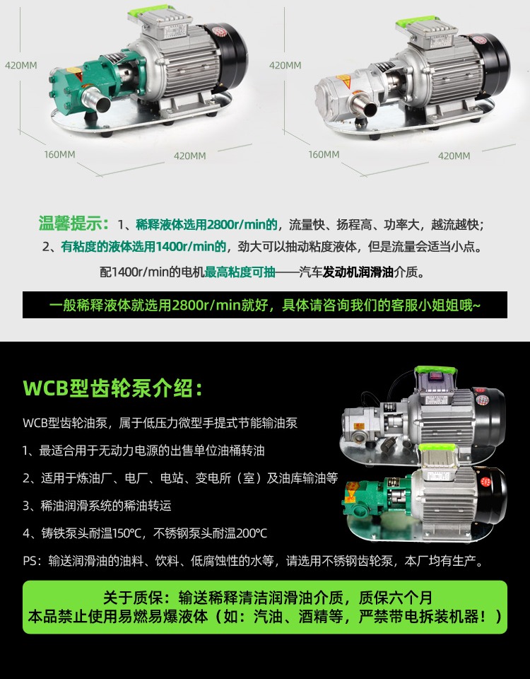 | Modelo | Cabeza de la bomba: WCB-30 soporte del cabezal de la bomba sin motor,Cabeza de la bomba: WCB-50 soporte del cabezal de la bomba sin motor,Cabeza de la bomba: WCB-75 soporte del cabezal de la bomba sin motor,Cabeza de la bomba: WCB-100 soporte del cabezal de la bomba sin motor,1400 velocidad de rotación: máquina WCB-30/750W/380V flujo: 15L/min,1400 velocidad de rotación: máquina WCB-30/750W/220V flujo: 15L/min,1400 velocidad de rotación: máquina WCB-50/750W/380V flujo: 25L/min,1400 velocidad de rotación: máquina WCB-50/750W/220V flujo: 25L/min,1400 rpm: máquina WCB-50/1.1KW/380V caudal 25L/min,1400 velocidad de rotación: máquina WCB-50/1.1KW/220V caudal: 25L/min,1400 velocidad de rotación: máquina WCB-75/750W/380V flujo: 37.5L/min,1400 velocidad de rotación: máquina WCB-75/750W/220V flujo: 37.5L/min,1400 velocidad de rotación: máquina WCB-100/1.1KW/380V caudal: 50L/min,1400 velocidad de rotación: máquina WCB-100/1.1KW/220V caudal: 50L/min,2800 velocidad de rotación: máquina WCB-30/750W/380V flujo: 30L/min,2800 velocidad de rotación: máquina WCB-30/750W/220V flujo: 30L/min,2800 velocidad de rotación: máquina WCB-50/750W/380V flujo: 50L/min,2800 velocidad de rotación: máquina WCB-50/750W/220V flujo: 50L/min,2800 velocidad de rotación: máquina WCB-75/750W/380V flujo: 75L/min,2800 velocidad de rotación: máquina WCB-75/750W/220V flujo: 75L/min,2800 velocidad de rotación: máquina WCB-100/1.1KW/220V caudal: 100L/min,2800 velocidad de rotación: máquina WCB-100/1.1KW/380V caudal: 100L/min,2800 velocidad de rotación: máquina WCB-100/1.5KW/220V caudal: 100L/min,2800 velocidad de rotación: máquina WCB-150/1.5KW/220V caudal: 150L/min,2800 velocidad de rotación: máquina WCB-200/2.2KW/220V caudal: 200L/min,1400 rpm: máquina de WCB-50 de acero inoxidable/750W/220V flujo: 25L/min,1400 velocidad de rotación: máquina de WCB-50 de acero inoxidable/750W/380V flujo: 25L/min,1400 rpm: máquina de WCB-75 de acero inoxidable/750W/220V flujo: 37.5L/min,1400 rpm: máquina de WCB-75 de acero inoxidable/750W/380V flujo: 37.5L/min,1400 velocidad de rotación: máquina de WCB-100 de acero inoxidable/1.1KW/220V caudal: 50L/min,1400 velocidad de rotación: máquina de WCB-100 de acero inoxidable/1.1KW/380V flujo: 50L/min,2800 velocidad de rotación: máquina de WCB-50 de acero inoxidable/750W/220V flujo: 50L/min,2800 velocidad de rotación: máquina de WCB-50 de acero inoxidable/750W/380V flujo: 50L/min,2800 velocidad de rotación: máquina de WCB-75 de acero inoxidable/750W/220V flujo: 75L/min,2800 velocidad de rotación: máquina de WCB-75 de acero inoxidable/750W/380V flujo: 75L/min,2800 rpm: máquina de WCB-100 de acero inoxidable/1.1KW/220V caudal: 100L/min,2800 rpm: máquina de WCB-100 de acero inoxidable/1.1KW/380V flujo: 100L/min,Para modelos personalizados, tome este artículo y comuníquese con el servicio de atención al cliente para una cotización separada. |