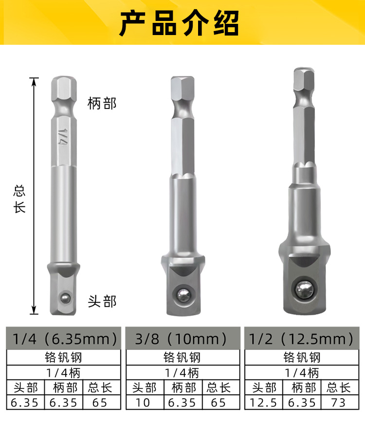 | Especificaciones y modelos | Seis juegos de cabeza de conversión (65 + 150 mm) en carcasa de espuma, seis juegos de cabeza de conversión (65 + 150 mm) en bolsa autopeinada, nueve juegos de cabeza de conversión (50 + 65 + 150 mm), tres juegos de 50 mm de longitud, uno de cada cuatro (6,35), 50 mm de longitud, tres de cada ocho (9,5), 50 mm de longitud, 65 mm de tres juegos, uno de cada cuatro (12,7), 65 mm de longitud de vuelo pequeño (6,35), 65 mm de longitud de vuelo medio (3 / 8 (9,5), 73mm de longitud de vuelo grande (12,7), 1501 juegos de vuelo pequeño/ 4 (6,35) longitud 150 mm, zhongfei 3 / 8 (9,5) longitud 150 mm, Dafei 1 / 2 (12,7) longitud 150 mm, tres juegos (mango redondo sds), 1 / 4 (6,35 mm) Mango redondo dos pozos dos ranuras, 3 / 8 (9,5 mm) Mango redondo dos pozos dos ranuras, 1 / 2 (12,7 mm) Mango redondo dos pozos dos ranuras, tres juegos de anillo de color de galvanoplastia, 1 / 4 * 65mm anillo de color de galvanoplastia, 3 / 8 * 65mm anillo de color de galvanoplastia, 1 / 2 * 73mm anillo de color de galvanoplastia |