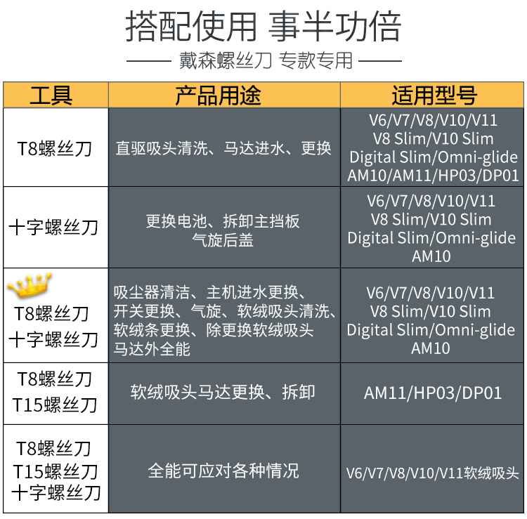 | Especificaciones y modelos | [cruz] destornillador, [plum blossom] destornillador t8, destornillador t8 + palanca, [v6 - v15 general foundation] conjunto de desmontaje, [v6] conjunto de limpieza de desmontaje, [v6 - v15 general upgrade] conjunto de limpieza de desmontaje, [actualización general V6 - v15] desmontar el conjunto de limpieza + paquete de almacenamiento, [actualización general V6 - v15] desmontar el conjunto de limpieza + paquete de almacenamiento + cepillo de limpieza, [actualización general V6 - v15] desmontar el conjunto de limpieza + paquete de almacenamiento de camuflaje, [actualización general v7 - 15] desmontar el conjunto de limpieza + paquete de almacenamiento de camuflaje, [actualización general v10 Slim / V12 / cabezal de succión láser] desmontar el conjunto de limpieza + paquete de almacenamiento de camuflaje, [conjunto de limpieza v10 Slim / V12 / cabezal de succión láser] conjunto de limpieza, [v10 Slim / V12 / cabezal de succión láser] conjunto de limpieza + paquete de almacenamiento, [v7 - 15 cabezal de succión láser]v10 Slim / V12 / cabeza de succión láser universal] conjunto de limpieza + paquete de almacenamiento de camuflaje, [flor de ciruela] destornillador t6, [flor de ciruela] destornillador t15, [compra recomendada] destornillador más imán, [recomendación especial] Dyson desmonta la palanca, [ciclón v6] desmontar el separador, [recomendación especial] cepillo de limpieza de la barra de extensión, [omni - glide] conjunto de desmontaje de la cabeza de succión [t8 + Cruz + t6 + t9] |