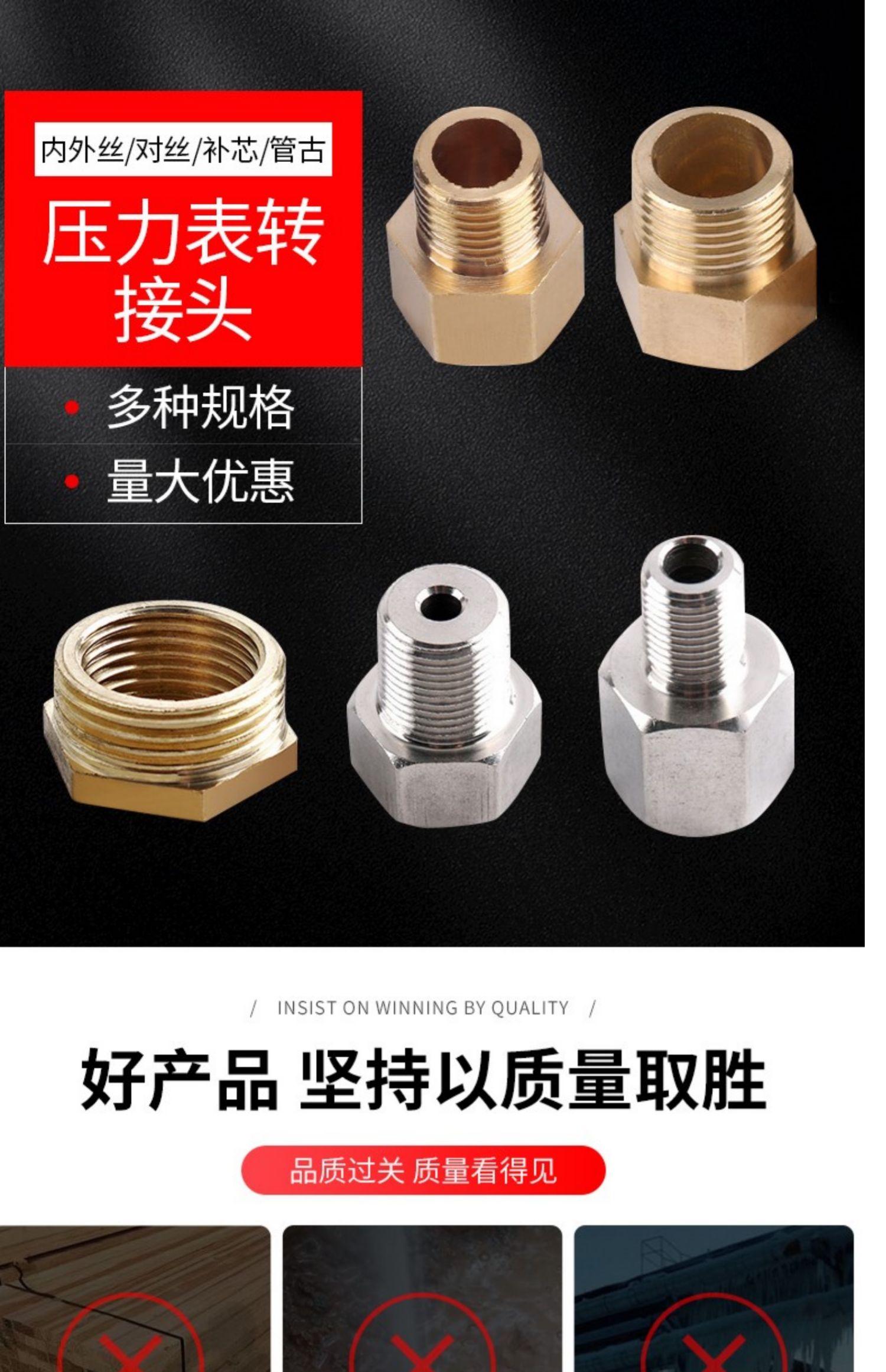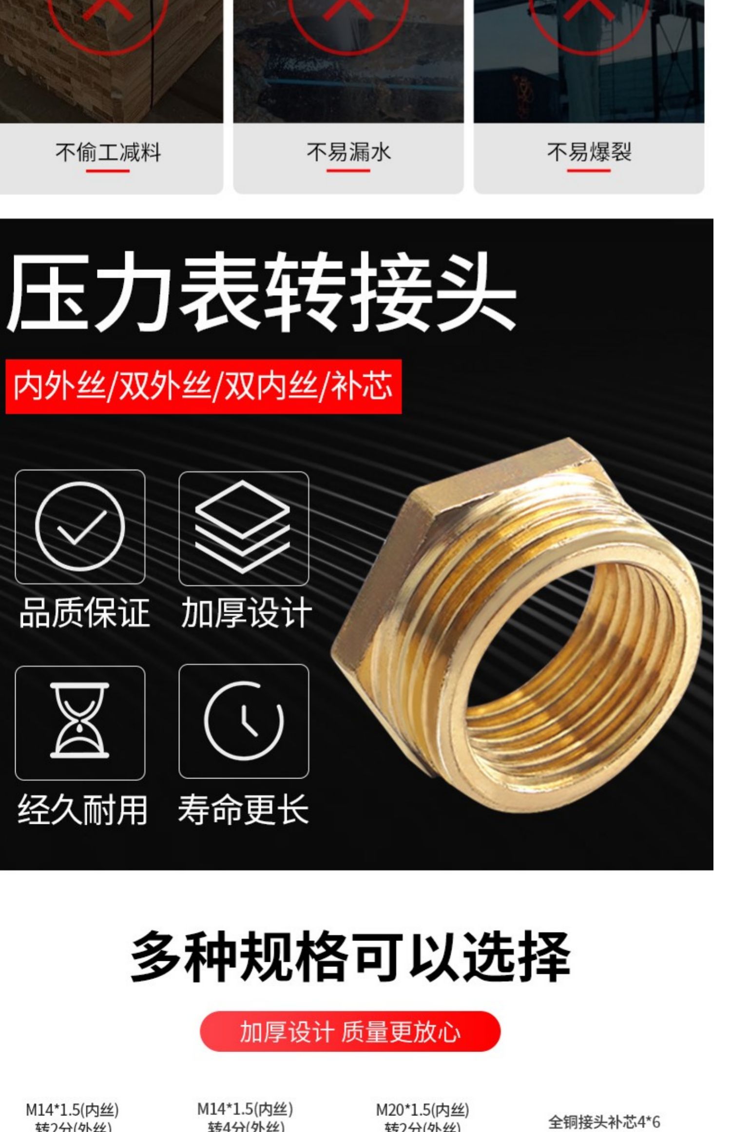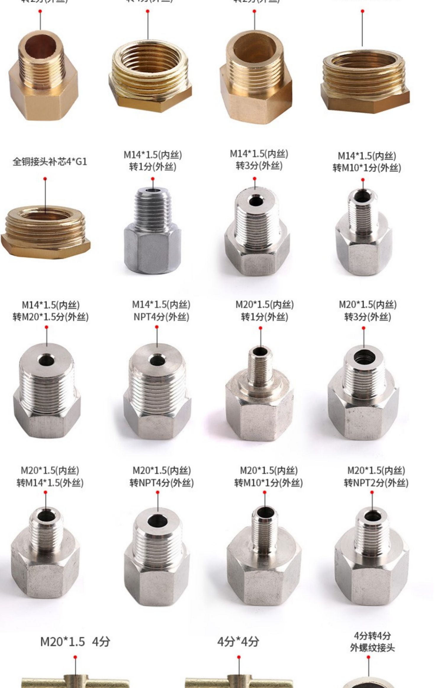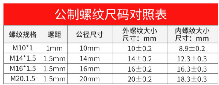 | Especificaciones y modelos | ▼▼▼以下为黄铜/铁材质转接头/补芯▼▼▼,M14*1.5(内丝)转2分(外丝),M14*1.5(内丝)转4分(外丝),M20*1.5(内丝)转4分(外丝),全铜接头补芯4*6(内丝4分转外丝6分),全铜接头补芯4*G1(内丝4分转外丝1寸),螺旋塞 铜160克 4分*M20*1.5,螺旋塞 铜160克 4分*4分,三通旋塞阀 304不锈钢 4分*M20*1.5,铁质4分转4分外螺纹接头,▼▼▼以下为304不锈钢材质转接头▼▼▼,▼▼▼以下为M14*1.5内丝转外丝▼▼▼,304不锈钢M14*1.5(内丝)转1/8(1分)(外丝),304不锈钢M14*1.5(内丝)转2分(外丝),304不锈钢M14*1.5(内丝)转3/8(3分)(外丝),304不锈钢内丝M14*1.5 转外丝4分,304不锈钢M14*1.5(内丝)转M10*1(外丝),304不锈钢M14*1.5(内丝)转M20*1.5(外丝),304不锈钢内丝M14*1.5 转外丝M14*1.5,▼▼▼以下为M20*1.5内丝转外丝▼▼▼,304不锈钢M20*1.5(内丝)转1/8(1分)(外丝),304不锈钢M20*1.5(内丝)转G 2分(外丝),304不锈钢M20*1.5(内丝)转3/8(3分)(外丝),304不锈钢内丝M20*1.5 转外丝4分,304不锈钢内丝M20*1.5 转外丝6分,304不锈钢M20*1.5(内丝)转M10*1(外丝),304不锈钢M20*1.5(内丝)转M14*1.5(外丝),304不锈钢内丝M20*1.5 转外丝M16*1.5,304不锈钢内丝M20*1.5 转外丝M20*1.5,▼▼▼以下为M10*1内丝转外丝▼▼▼,内丝M10*1 转外丝M10*1,内丝M10*1 转外丝1分,内丝M10*1 转外丝2分,内丝M10*1 转外丝M14*1.5,▼▼▼以下为1分内丝转外丝▼▼▼,内丝1分 转外丝1分,内丝1分 转外丝2分,内丝1分 转外丝M10*1,内丝1分 转外丝M14*1.5,▼▼▼以下为2分内丝转外丝▼▼▼,内丝2分 转外丝1分,内丝2分 转外丝2分,内丝2分 转外丝3分,内丝2分 转外丝4分,内丝2分 转外丝M10*1,内丝2分 转外丝M14*1.5,内丝2分 转外丝M20*1.5,▼▼▼以下为3分内丝转外丝▼▼▼,内丝3分 转外丝2分,内丝3分 转外丝3分,内丝3分 转外丝4分,内丝3分 转外丝M20*1.5,▼▼▼以下为4分内丝转外丝▼▼▼,内丝4分 转外丝2分,内丝4分 转外丝3分,内丝4分 转外丝4分,内丝4分 转外丝6分,内丝4分 转外丝M14*1.5,内丝4分 转外丝M16*1.5,304不锈钢M16*1.5(内丝)转M27*2(外丝),内丝4分 转外丝M20*1.5,▼▼▼以下为6分内丝转外丝▼▼▼,内丝6分 转外丝3分,内丝6分 转外丝4分,内丝6分 转外丝6分,内丝6分 转外丝M20*1.5,▼▼▼以下为1寸内丝转外丝▼▼▼,内丝1寸 转外丝4分,内丝1寸 转外丝6分,内丝1寸 转外丝1寸,▼▼▼以下为NPT美制螺纹转接头▼▼▼,304不锈钢M14*1.5(内丝)转NPT 1/2(4分)(外丝),304不锈钢内丝M14*1.5 转外丝1/4NPT,304不锈钢M20*1.5(内丝)转NPT 2分(外丝),304不锈钢内丝M20*1.5 转外丝3/4NPT,304不锈钢M20*1.5(内丝)转NPT 1/2(4分)(外丝),304不锈钢内丝1/2NPT 转外丝M16*1.5,304不锈钢内丝1/2NPT 转外丝M20*1.5 |