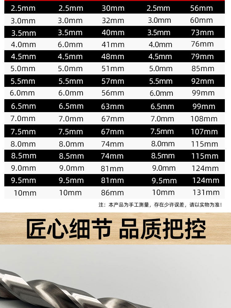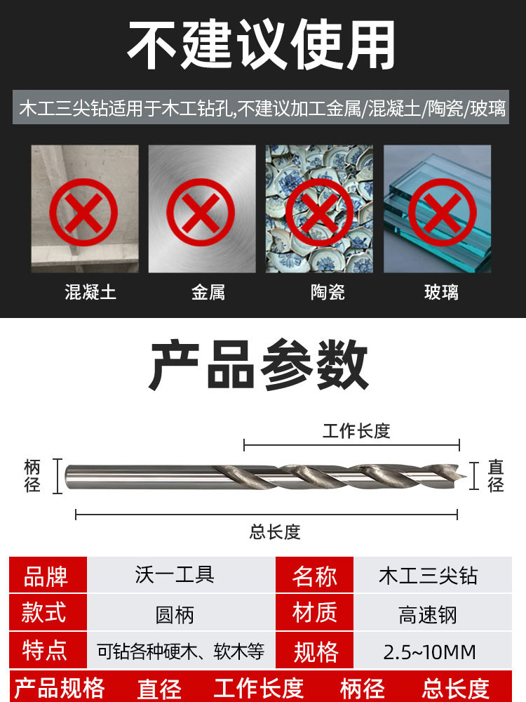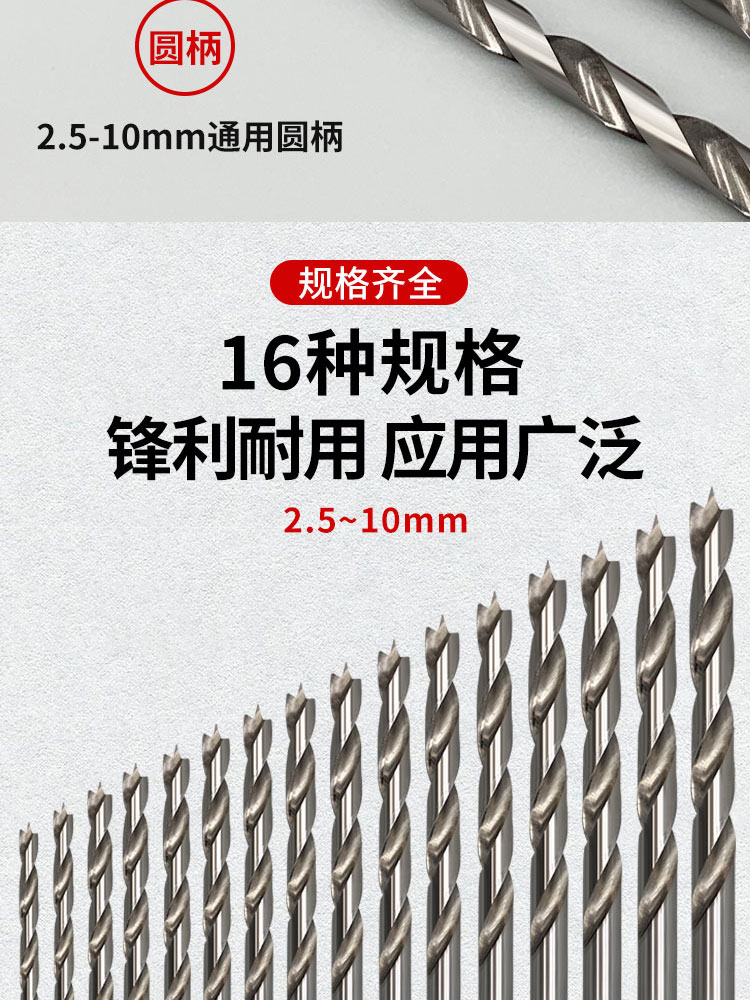 | Especificaciones y modelos | 圆柄高速钢2.5mm三尖钻 1支装,圆柄高速钢2.5mm三尖钻 3支装,圆柄高速钢2.5mm三尖钻 5支装,圆柄高速钢3mm三尖钻 1支装,圆柄高速钢3mm三尖钻 3支装,圆柄高速钢3mm三尖钻 5支装,圆柄高速钢3.5mm三尖钻 1支装,圆柄高速钢3.5mm三尖钻 3支装,圆柄高速钢3.5mm三尖钻 5支装,圆柄高速钢4mm三尖钻 1支装,圆柄高速钢4mm三尖钻 3支装,圆柄高速钢4mm三尖钻 5支装,圆柄高速钢4.5mm三尖钻 1支装,圆柄高速钢4.5mm三尖钻 3支装,圆柄高速钢4.5mm三尖钻 5支装,圆柄高速钢5mm三尖钻 1支装,圆柄高速钢5mm三尖钻 3支装,圆柄高速钢5mm三尖钻 5支装,圆柄高速钢5.5mm三尖钻 1支装,圆柄高速钢5.5mm三尖钻 3支装,圆柄高速钢5.5mm三尖钻 5支装,圆柄高速钢6mm三尖钻 1支装,圆柄高速钢6mm三尖钻 3支装,圆柄高速钢6mm三尖钻 5支装,圆柄高速钢6.5mm三尖钻 1支装,圆柄高速钢6.5mm三尖钻 3支装,圆柄高速钢6.5mm三尖钻 5支装,圆柄高速钢7mm三尖钻 1支装,圆柄高速钢7mm三尖钻 3支装,圆柄高速钢7mm三尖钻 5支装,圆柄高速钢7.5mm三尖钻 1支装,圆柄高速钢7.5mm三尖钻 3支装,圆柄高速钢7.5mm三尖钻 5支装,圆柄高速钢8mm三尖钻 1支装,圆柄高速钢8mm三尖钻 3支装,圆柄高速钢8mm三尖钻 5支装,圆柄高速钢8.5mm三尖钻 1支装,圆柄高速钢8.5mm三尖钻 3支装,圆柄高速钢8.5mm三尖钻 5支装,圆柄高速钢9mm三尖钻 1支装,圆柄高速钢9mm三尖钻 3支装,圆柄高速钢9mm三尖钻 5支装,圆柄高速钢9.5mm三尖钻 1支装,圆柄高速钢9.5mm三尖钻 3支装,圆柄高速钢9.5mm三尖钻 5支装,圆柄高速钢10mm三尖钻 1支装,圆柄高速钢10mm三尖钻 3支装,圆柄高速钢10mm三尖钻 5支装,圆柄高速钢5件套3/4/5/6/7,圆柄高速钢6件套3/4/5/6/7/8,圆柄高速钢7件套4/5/6/7/8/9/10,圆柄高速钢8件套3/4/5/6/7/8/9/10,圆柄高速钢三尖钻16件全套装,黑色限位环2.5-14mm各1个套装 带2个扳手,8件套 黑限位环3/4/5/6/7/8/9/10带1个扳手,6件套 黑限位环3/4/5/6/7/8各1个 带2个扳手,圆柄16件套多功能钻头组合 套装塑盒,圆柄高碳钢三尖钻8件套3-10mm塑盒包装,圆柄高速钢三尖钻8件件套3-10mm塑盒包装,镀钛圆柄三尖钻25支装(铁盒包装) |