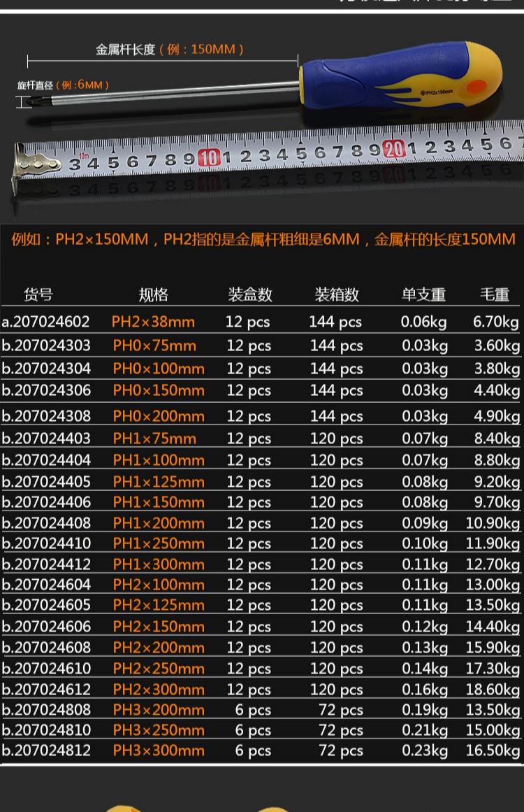 | Especificaciones y modelos | Destornillador cruzado ph0 3 * 75 mm, destornillador cruzado ph0 3 * 100 mm, destornillador cruzado ph0 3 * 150 mm, destornillador cruzado ph0 3 * 200 mm, destornillador cruzado ph1 5 * 75 mm, destornillador cruzado ph1 5 * 100 mm, destornillador cruzado ph1 5 * 150 mm, destornillador cruzado ph1 5 * 200 mm, destornillador cruzado ph1 5 * 250 mm, destornillador cruzado ph1 5 * 300mm, destornillador cruzado ph2 * 125mm, destornillador cruzado ph2 * 1502 * 1502 mm mm, destornillador cruzado ph2 6 * 200 mm, destornillador cruzado ph2 6 * 250mm, destornillador cruzado ph2 6 * 300mm, destornillador cruzado ph3 8 * 200 mm, destornillador cruzado ph3 8 * 250mm, destornillador cruzado ph3 8 * 300mm, destornillador cruzado ph3 * 300mm, destornillador (8pcs) |