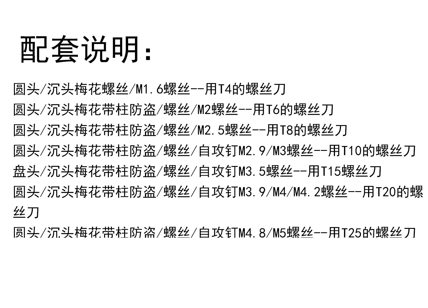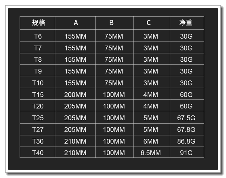 | Modelo de especificación | T4 (con tornillos M1.6) sin agujeros,T6 (con tornillos M2),T8 (con tornillos M2.5),T10 (con tornillos M3),T15 (con tornillos M3.5),T20 (con tornillos M4),T25 (con tornillos M5),T30 (con tornillos M6),T40 (con tornillos M8) |
