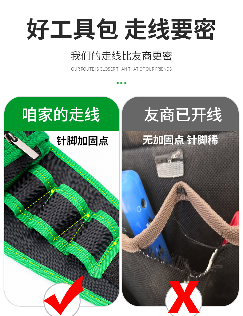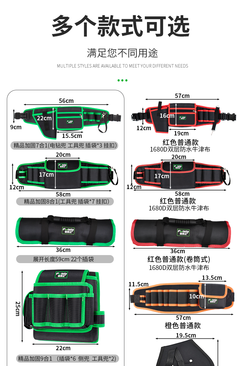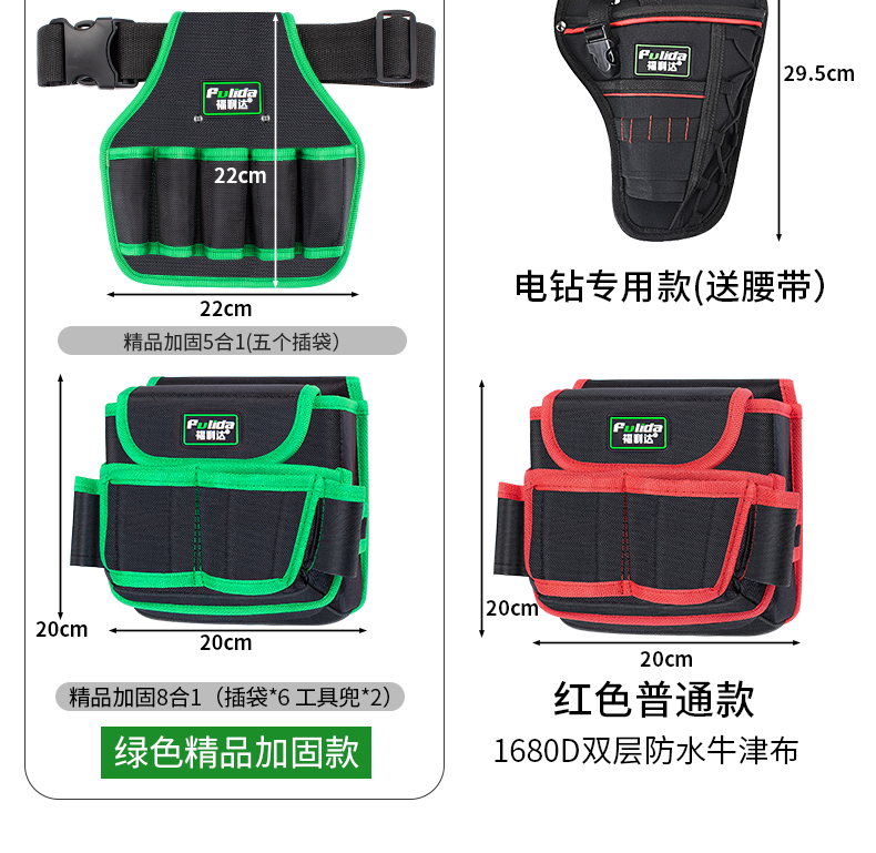 | Especificaciones y modelos | [refuerzo de alta calidad] bolsillos de una sola capa de cinco en uno - - [engrosamiento del 30%, [refuerzo de alta calidad] bolsillos de perforación eléctrica de siete en uno - - [engrosamiento del 30%, [refuerzo de alta calidad] bolsillos de herramientas de ocho en uno - - [engrosamiento del 30%), [refuerzo de alta calidad] bolsillos multifuncionales de ocho en uno - - [engrosamiento del 30%, [refuerzo de alta calidad más sólido] bolsillos sesgados de nueve enchufes - - [engrosamiento del 30%, [refuerzo de alta calidad] bolsillos de dos pisos de nueve en uno - - [engrosamiento del 30%, [verde] bolsillos de rollo - [engrosamiento del 30%] bolsillos de perforación eléctrica] - [engrosamiento del 30% - [cinturón] - [engrosamiento del 30%,rojo] bolsillos de perforación eléctrica de siete en Uno - - [engrosamiento del 30%, [color rojo] bolsillos de herramientas de ocho en uno - - [engrosamiento del 30%, [rojo] bolsillos de doble capa de ocho en uno multifuncionales - - [engrosamiento del 30%, [rojo] bolsillos sesgados de nueve enchufes - - [engrosamiento del 30%] y [rojo] paquetes de clavos - - [engrosamiento del 30%, [rojo] kits de herramientas de rollo - - [engrosamiento del 30%] y [naranja económico] Nueve enchufes en el bolso parcial, [modelo económico naranja] bolso de herramientas ocho en uno |