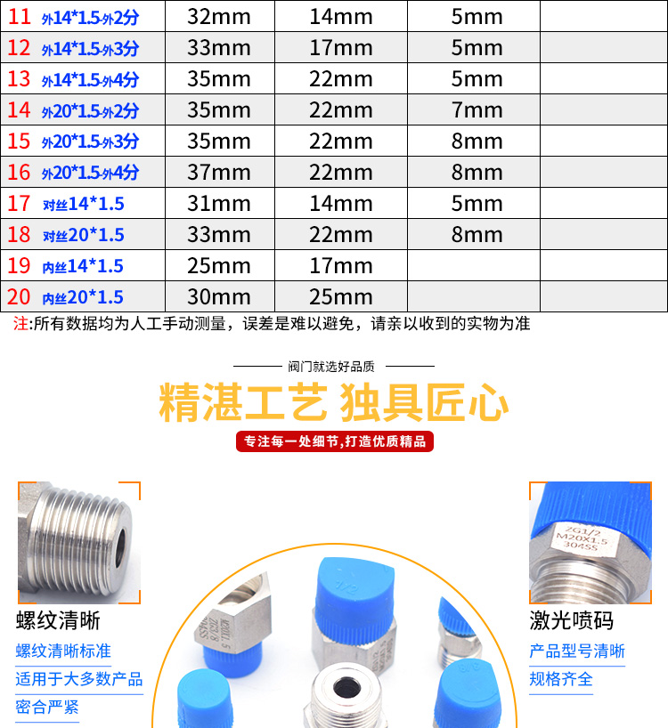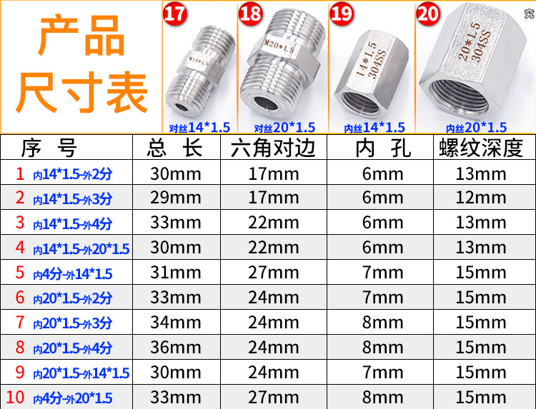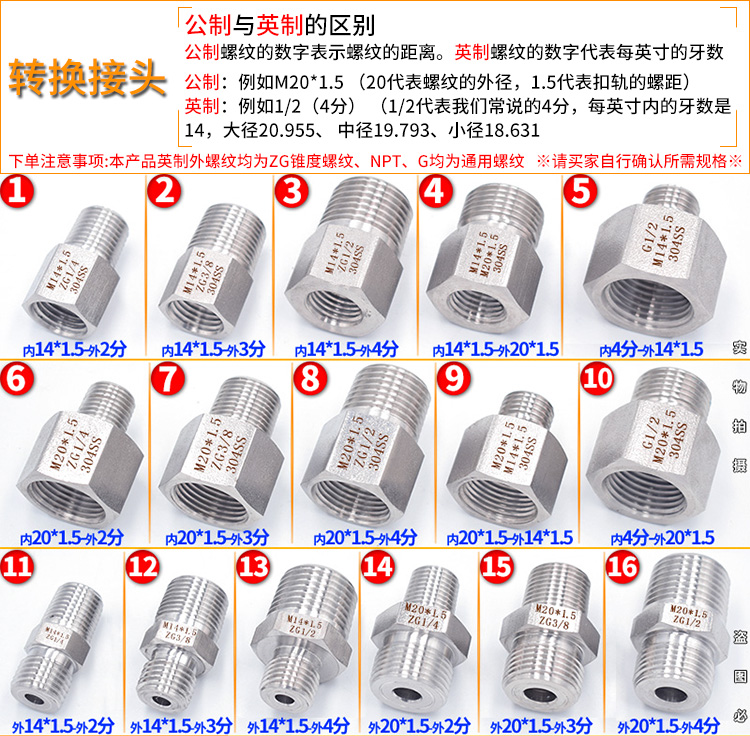Acoplamiento del manómetro 304 acero inoxidable conector de conversión interna y externa M20 * 1.5 14 * 1.5 2 / 3 / 4 acoplamiento reducido