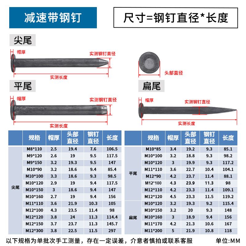 | Especificaciones y modelos | M8*110尖尾 (5个),M8*110尖尾 (60个/约5斤),M9*120尖尾 (5个),M9*120尖尾 (37个/约5斤),M9*150尖尾 (5个),M9*150尖尾 (30个/约5斤),M10*90尖尾 (5个),M10*90尖尾 (52个/约5斤),M10*100尖尾 (5个),M10*100尖尾 (45个/约5斤),M10*120尖尾 (5个),M10*120尖尾 (37个/约5斤),M10*150尖尾 (5个),M10*150尖尾 (30个/约5斤),M10*160尖尾 (5个),M10*160尖尾 (28个/约5斤),M11*110尖尾 (5个),M11*110尖尾 (34个/约5斤),M12*100尖尾 (5个),M12*100尖尾 (29个/约5斤),M12*120尖尾 (5个),M12*120尖尾 (26个/约5斤),M12*150尖尾 (2个),M12*150尖尾 (21个/约5斤),M12*300尖尾 (1个),M12*300尖尾 (10个/约5斤),M10*85平尾 (5个),M10*85平尾 (49个/约5斤),M10*100平尾 (5个),M10*100平尾 (43个/约5斤),M10*120平尾 (5个),M10*120平尾 (36个/约5斤),M11*110平尾 (5个),M11*110平尾 (32个/约5斤),M12*90平尾 (5个),M12*90平尾 (30个/约5斤),M12*100平尾 (5个),M12*100平尾 (28个/约5斤),M12*110平尾 (5个),M12*110平尾 (19个/约5斤),M12*120平尾 (2个),M12*120平尾 (22个/约5斤),M10*120扁尾 (5个),M10*120扁尾 (43个/约5斤),M10*150扁尾 (5个),M10*150扁尾 (32个/约5斤),M10*160扁尾 (5个),M10*160扁尾 (26个/约5斤),M11*170扁尾 (2个),M11*170扁尾 (22个/约5斤),M11*200扁尾 (2个),M11*200扁尾 (19个/约5斤) |