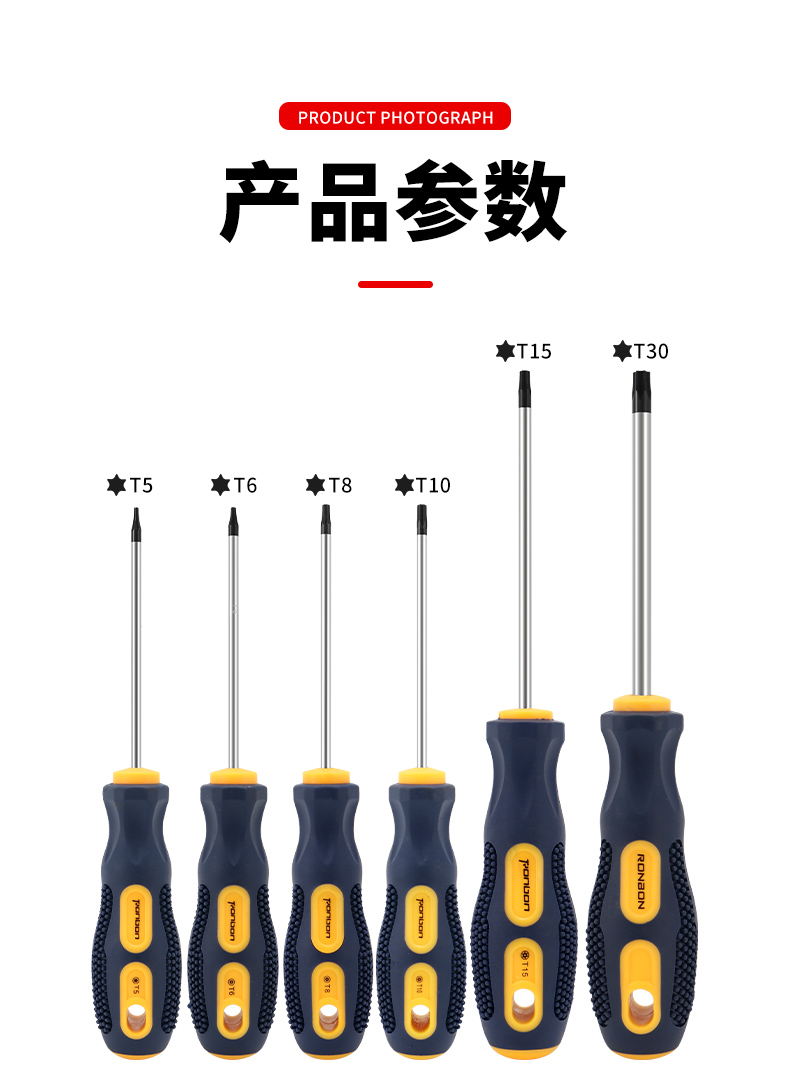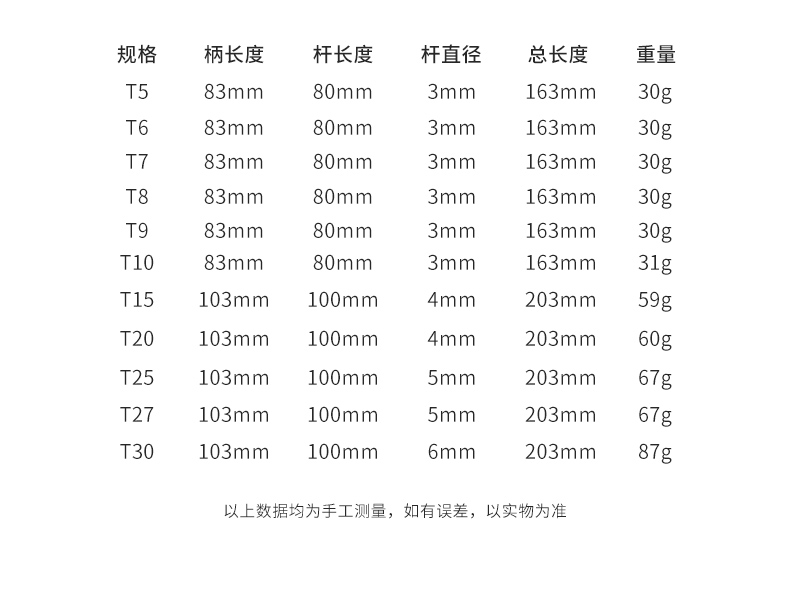 | Especificaciones y modelos | Sin agujero t5, agujero medio t6, agujero medio t7, agujero medio t8, agujero medio t9, agujero medio t10, agujero medio t15, agujero medio t20, agujero medio t25, agujero medio t27, agujero medio t30, agujero medio t40, comúnmente T10 - t30, 12 juegos completos |