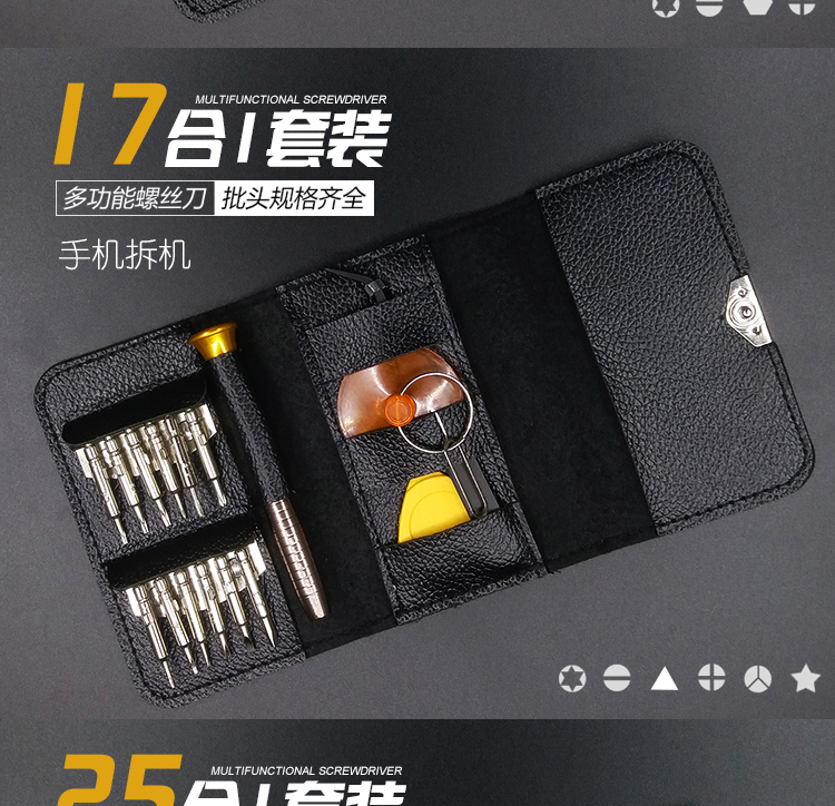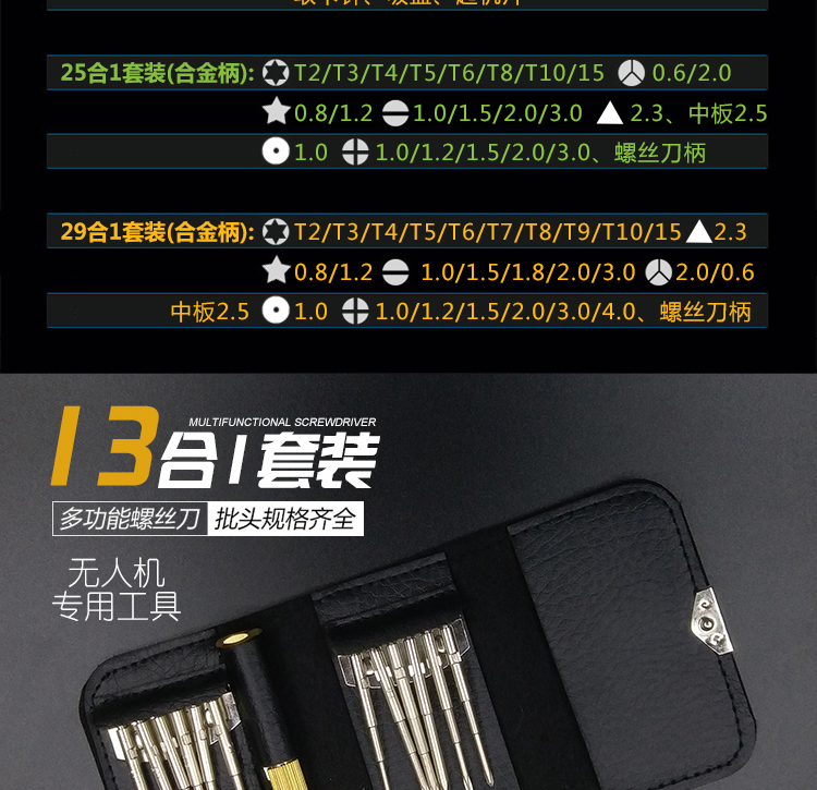 | Especificaciones y modelos | Modelo de billetera [25 en uno] versión de absorción magnética, modelo de billetera [25 en uno] versión atornillada a mano, caja verde [32 en uno] conjunto, Caja amarilla [32 en uno] conjunto, versión de mijo [25 en uno] mango de plástico, versión de mijo [25 en uno] mango de aluminio |