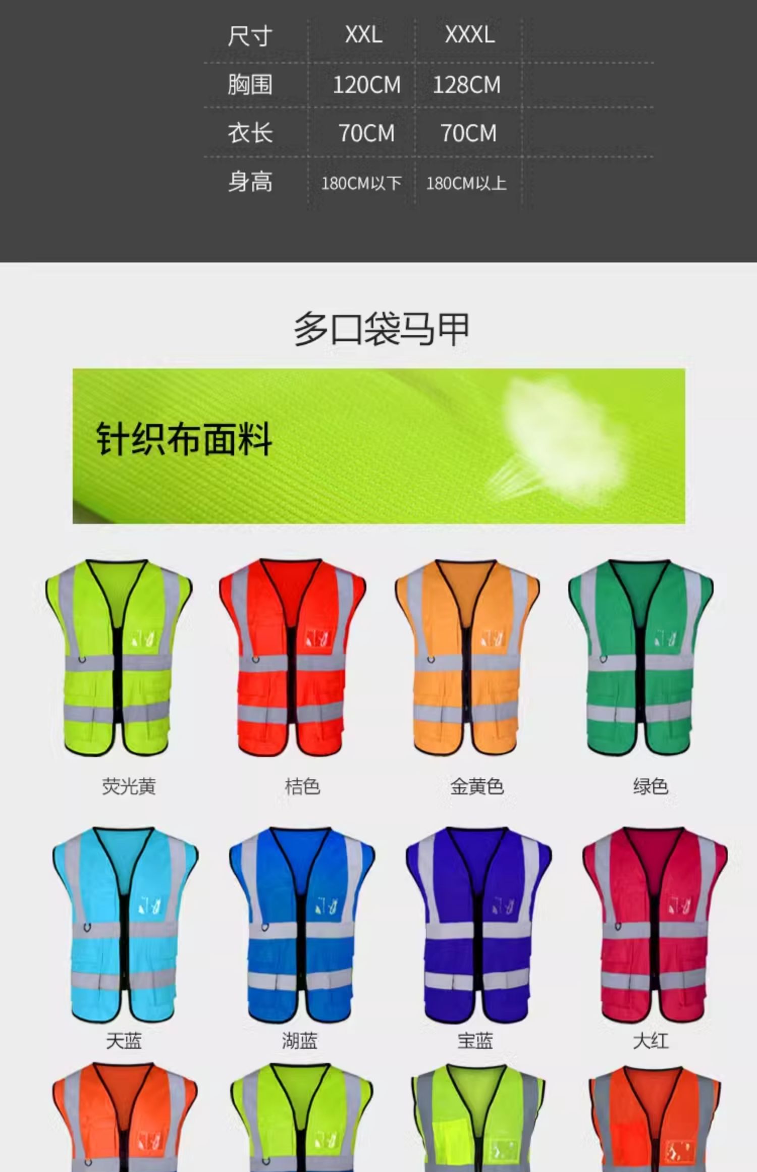 | Especificaciones y modelos | Modelo de bolsillo múltiple amarillo fluorescente, modelo de bolsillo múltiple amarillo fluorescente de mayor tamaño (opción de más de 180 kilogramos), modelo de bolsillo múltiple naranja, modelo de bolsillo múltiple azul cielo, modelo de bolsillo múltiple lago azul, modelo de bolsillo múltiple baolan, modelo de bolsillo múltiple verde, modelo de bolsillo múltiple rojo grande, modelo de bolsillo múltiple dorado, modelo de bolsillo múltiple negro, Modelo de bolsillo múltiple amarillo + azul empalmado, modelo de bolsillo múltiple naranja + azul empalmado, modelo de bolsillo múltiple naranja, modelo de bolsillo múltiple amarillo fluorescente de malla transpirable, modelo de bolsillo múltiple naranja empalmado amarillo malla transpirable + azul empalmado, modelo de bolsillo múltiple fluorescente amarillo sin bolsillo, cremallera amarilla sin bolsillo, modelo de refuerzo de cremallera amarilla fluorescente, cremallera amarilla transpirable, cremallera amarilla sin bolsillo fluorescente, cremallera amarilla tela de malla transpirable - versión reforzada de la cremallera amarillo fluorescente, cláusula gris de tela amarilla ordinaria, cláusula gris de tela naranja ordinaria, cláusula amarilla de tela naranja ordinaria, malla delgada de verano - pequeña red verde |