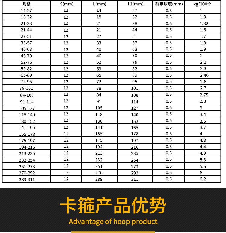 | Especificaciones | Si no se seleccionan especificaciones, consulte al servicio al cliente, diámetro 14 - 27 mm, diámetro 18 - 32 mm, diámetro 21 - 38 mm, diámetro 27 - 51 mm, diámetro 33 - 57 mm, diámetro 40 - 63 mm, diámetro 46 - 70 mm, diámetro 52 - 76 mm, diámetro 59 - 82 mm, diámetro 65 - 89 mm, diámetro 72 - 95 mm, diámetro 78 - 101 mm, diámetro 91 - 114mm, diámetro 105 - 127mm, diámetro 118 - 140 mm, diámetro 130 - 152 mm, diámetro 141 - 165 mm, diámetro 155 - 178mm, diámetro 175 - 197mm, diámetro 194 - 216 mm, diámetro 213 - 235 mm, diámetro 232 - 290 mm, diámetro- 310mm |