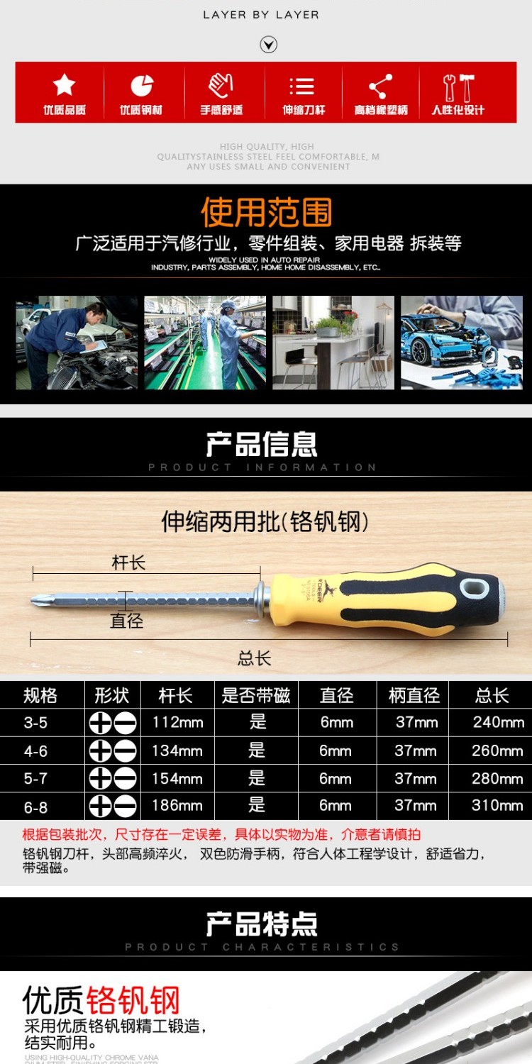 | Modelo de especificación | 3-5 pulgadas ajustable (9156A),4-6 pulgadas ajustable (9156B),5-7 pulgadas ajustable (9156C),6-8 pulgadas ajustable (9156D),Destornillador telescópico de doble propósito con trinquete 9159A,Destornillador de doble uso 6x100mm 9980A,Ultra corto telescópico ajustable 9160 |