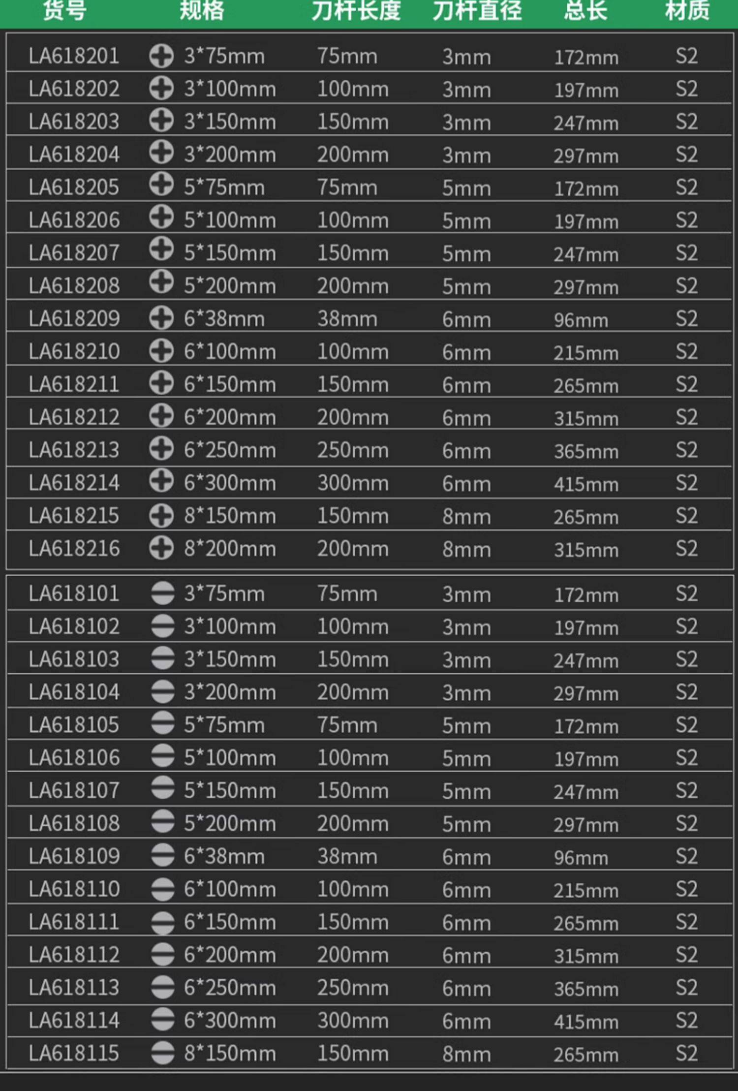 | Especificaciones y modelos | La618201 Cross 3 * 75mm, la618202 Cross 3 * 100mm, la618203 Cross 3 * 150mm, la618204 Cross 3 * 200mm, la618205 Cross 5 * 75mm, la618206 Cross 5 * 100mm, la618207 Cross 5 * 150mm, la618208 Cross 5 * 200mm, la618209 Cross 6 * 38mm, la618210 Cross 6 * 100mm, la618211 Cross 6 * 150mm, la618212 Cross 6 * 200mm, la618213 Cross 6 * 250mm, la618214 Cross 6 * 300mm, la8215 * 1508 Cross mm, la618216 Cruz 8 * 200 mm, la618101 palabra 3 * 75 mm, la618102 palabra 3 * 100 mm, la618103 palabra 3 * 150 mm, la618104 palabra 3 * 200 mm, la618105 palabra 5 * 75 mm, la618106 palabra 5 * 100 mm, la618107 palabra 5 * 150 mm, la618108 palabra 5 * 200 mm, la618109 palabra 6 * 38 mm, la618110 palabra 6 * 100 mm, la618111 palabra 6 * 150 mm, la618112 palabra 6 * 200 mm, la618113 palabra palabra 6 * 250mm, la618114 palabra 6 * 300mm, la618115 palabra 8 * 150mm, la618116 palabra 8 * 200mm, la614306 6 juegos de uso común, 8 Juegos de uso común la618508, bolsa de almacenamiento de destornillador la210701 (tela de doble capa pequeña) |