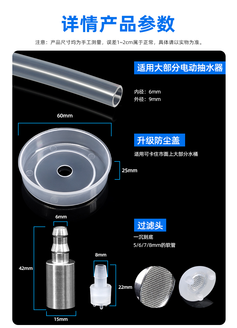 | Especificaciones y modelos | Tubo de silicona 1 metro de entrega (tapa de polvo + cabeza de filtro pp), tubo de silicona 2 metros de entrega (tapa de polvo + cabeza de filtro pp), tubo de silicona 3 metros de entrega (tapa de polvo + cabeza de filtro pp), tubo de silicona 4 metros de entrega (tapa de polvo + cabeza de filtro pp), tubo de silicona 5 metros de entrega (tapa de polvo + cabeza de filtro pp), tubo de silicona 1 metro de entrega (tapa de polvo + cabeza de hundimiento de malla de acero inoxidable 304), tubo de silicona 2 metros de entrega (tapa de polvo + cabeza de hundimiento de malla de acero inoxidable 304), tubo de silicona 3 metros de entrega (tapa de polvo + cabeza de hundimiento de malla de acero inoxidable 304), tubo de silicona 5 metros de entrega (tapa de polvo + cabeza de hundimiento de malla de acero inoxidable 304), tubo de silicona 6x9 mm (solo tubo de silicona tubo, sin piezas) |