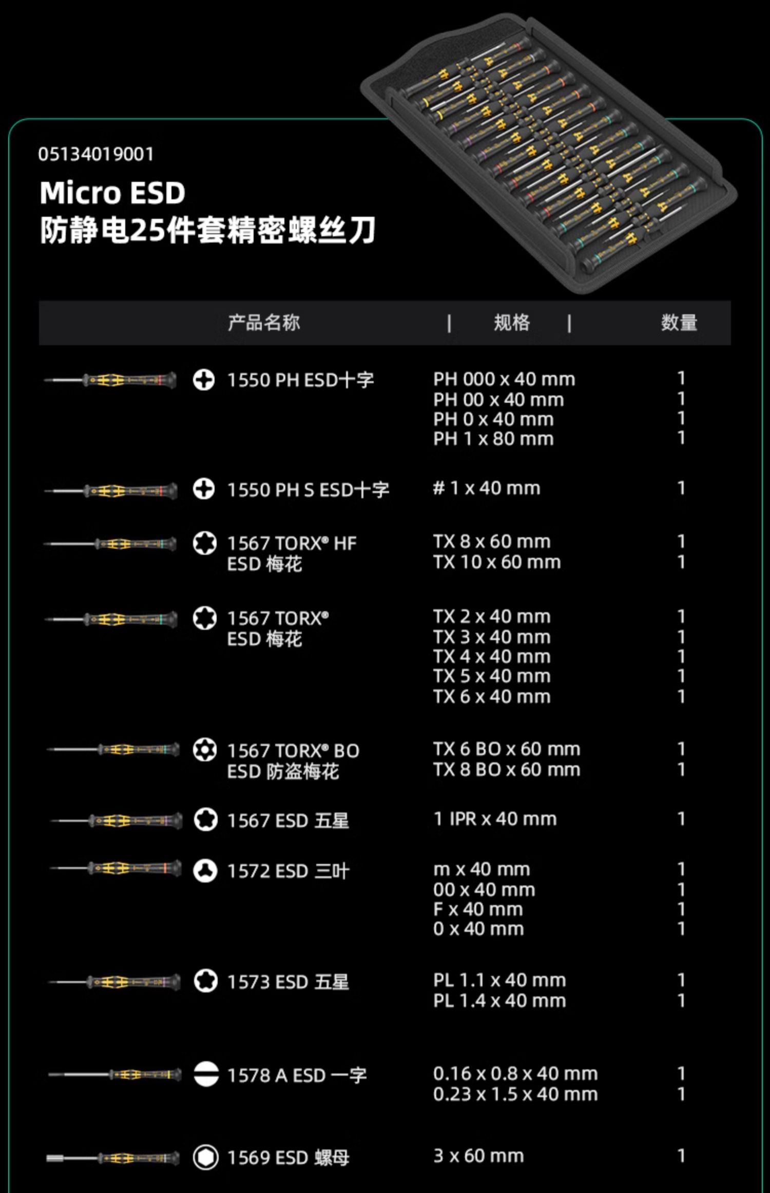 | Modelo de especificación | Universal [Juego de 12 piezas] (073675),Tipo profesional [juego de 12 piezas] (073677),Universal [Juego de 25 piezas] (134000),Tipo profesional antiestático [juego de 25 piezas] (134019),Bolso pequeño conveniente actualizado [juego de 29] (134027),2035 A [Juego de 6 piezas] (118150),2035 B [juego de 6 piezas] (118152),2050 [juego de 6 piezas] (030181),1578A antiestático [juego de 6 piezas] (030170),1550 antiestático [juego de 6 piezas] (030180) |