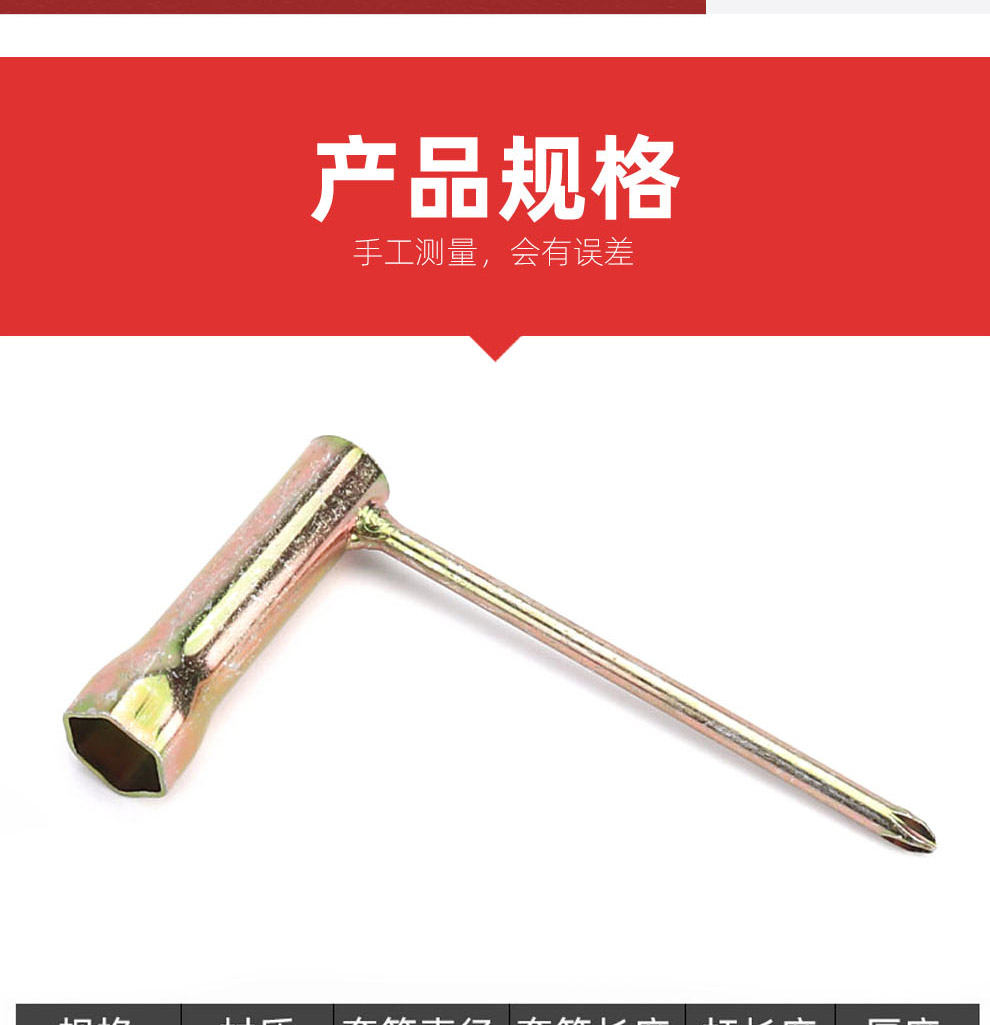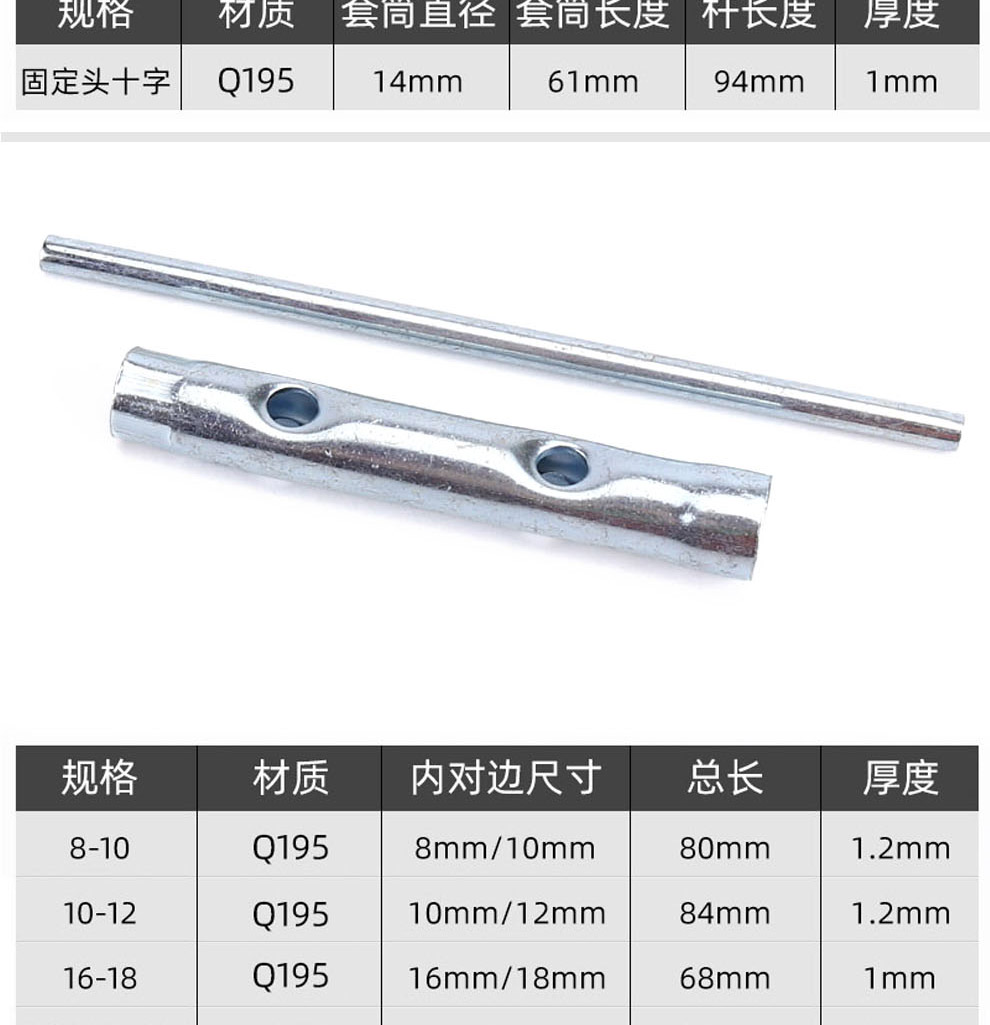 | Especificaciones y modelos | Llave de enchufe de Bujía [cruz de cabeza fija], 8 - 10 [barra de refuerzo de transmisión de 1,2 espesor], 10 - 12 [barra de refuerzo de transmisión de 1,2 espesor], 16 * 18 * 1,0 espesor [barra de refuerzo de transmisión], 16 * 60 * 1,0 espesor [barra de refuerzo de transmisión], 16 * 70 * 1,2 espesor [barra de refuerzo de transmisión], 17 * 19 * 1,0 espesor [barra de refuerzo de transmisión], 21 * 80 * 1,0 espesor [barra de refuerzo de transmisión], tres barras de refuerzo preferenciales a [dos barras de refuerzo de transmisión], tres barras de refuerzo preferenciales b [dos barras de refuerzo de transmisión], tres barras de refuerzo preferenciales c [2 barras de refuerzo de transmisión]se instalan seis [se envían dos barras de refuerzo], una de cada siete especificaciones [se envían dos barras de refuerzo] |
