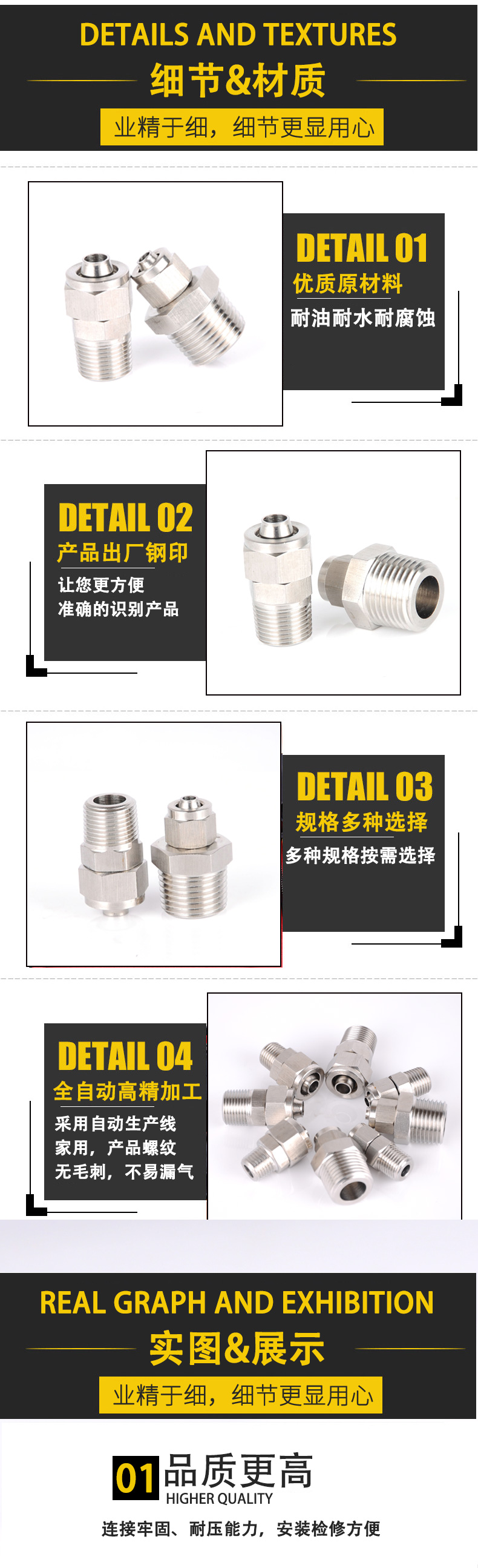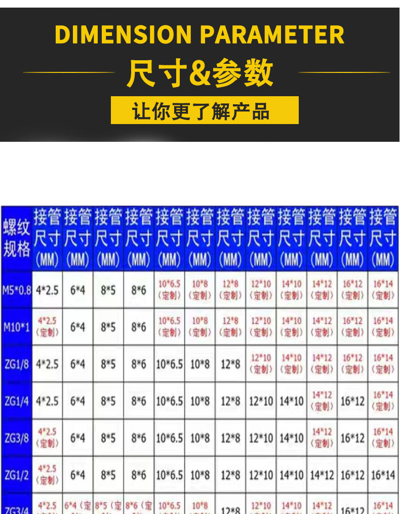 | Especificaciones | ZG1/8-Φ4*2.5,ZG1/8-Φ6*4,ZG1/8-Φ8*6,ZG1/8-Φ10*6.5,ZG1/8-Φ10*8,ZG1/8-Φ12*8,ZG1/8-Φ12*10,ZG1/8-Φ14*10,ZG1/8-Φ16*12,ZG1/4-Φ4*2.5,ZG1/4-Φ6*4,ZG1/4-Φ8*6,ZG1/4-Φ10*6.5,ZG1/4-Φ10*8,ZG1/4-Φ12*8,ZG1/4-Φ12*9,ZG1/4-Φ12*10,ZG1/4-Φ14*10,ZG1/4-Φ14*12,ZG1/4-Φ16*12,ZG3/8-Φ6*4,ZG3/8-Φ8*6,ZG3/8-Φ10*6.5,ZG3/8-Φ10*8,ZG3/8-Φ12*8,ZG3/8-Φ12*9,ZG3/8-Φ12*10,ZG3/8-Φ14*10,ZG3/8-Φ16*12,ZG3/8-Φ20*16,ZG1/2-Φ6*4,ZG1/2-Φ8*6,ZG1/2-Φ10*6.5,ZG1/2-Φ10*8,ZG1/2-Φ12*8,ZG1/2-Φ12*9,ZG1/2-Φ12*10,ZG1/2-Φ14*10,ZG1/2-Φ14*12,ZG1/2-Φ16*12,ZG1/2-Φ16*14,ZG1/2-Φ20*16,ZG3/4-Φ6*4,ZG3/4-Φ8*6,ZG3/4-Φ10*6.5,ZG3/4-Φ12*8,ZG3/4-Φ14*10,ZG3/4-Φ16*12,ZG3/4-Φ20*16,M5-Φ4*2.5,M5-Φ6*4,M5-Φ8*6,M6-Φ6*4,M8*1-Φ6*4,M10*1-Φ6*4,M10*1-Φ8*6,M20*1.5-Φ6*4,M20*1.5-Φ8*6 |