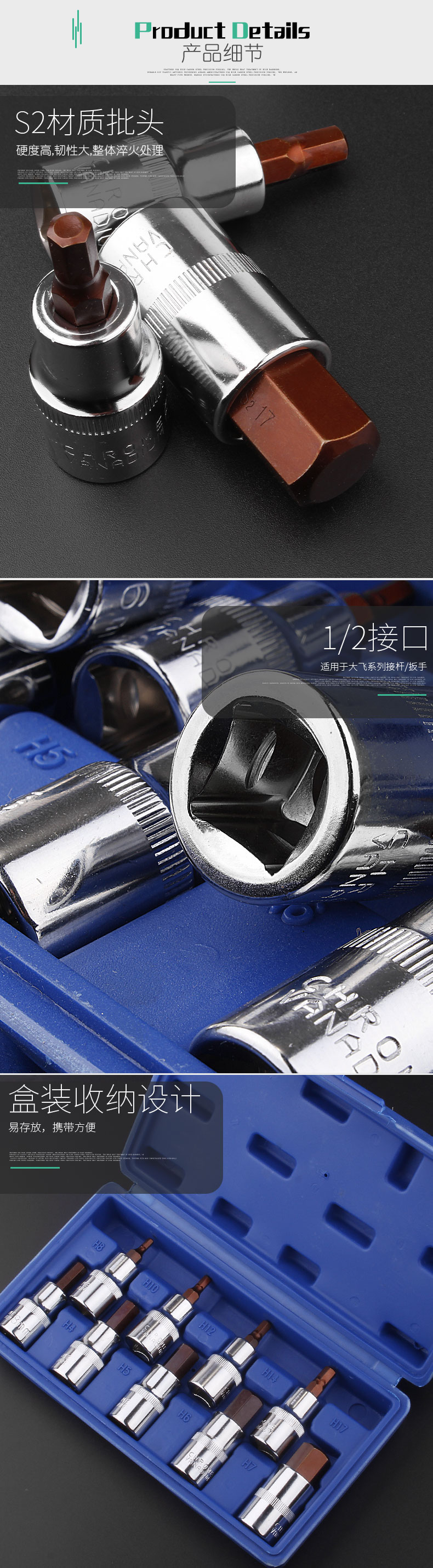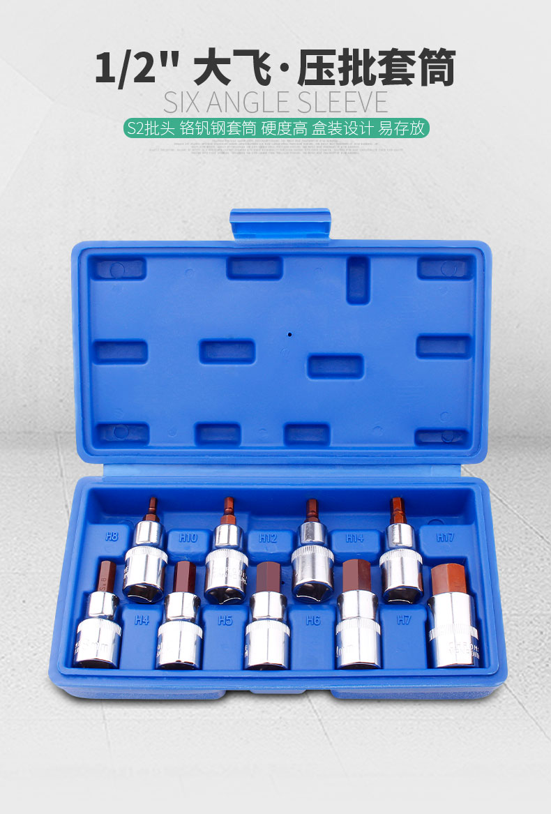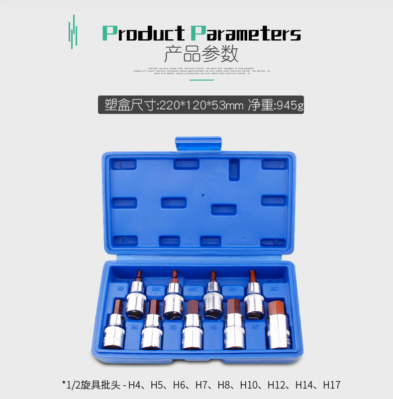 | Especificaciones y modelos | La manga hexagonal interna de 4 mm H4 tiene una longitud total de 60 mm, la manga hexagonal interna de 5 mm H5 tiene una longitud total de 60 mm, la manga hexagonal interna de 6 mm H6 tiene una longitud total de 60 mm, la manga hexagonal interna de 7 mm H7 tiene una longitud total de 60 mm, la manga hexagonal interna de 8 mm H8 tiene una longitud total de 60 mm, la manga hexagonal interna de 10 mm H10 tiene una longitud total de 60 mm, la manga hexagonal interna de 1/2 mm H1/2 tiene una longitud total de 60 mm, la manga hexagonal interna de 14 mm H14 tiene una longitud total de 60 mm, la manga hexagonal interna de 17 mm H17 tiene una longitud total de 60 mm, la manga de ajuste de prensa de 1 / 2 alargada H4, la manga de ajuste de prensa de 1 / 2 alargada H5, 1 / 2 manguito de ajuste de prensa alargado H6, 1 / 2 manguito de ajuste de prensa alargado H8, 1 / 2 manguito de ajuste de prensa alargado H10, conjunto de cabeza de lote de herramientas de tornillo de 1 / 2, conjunto de manguito de ajuste de prensa de 60 piezas de Chuantao |