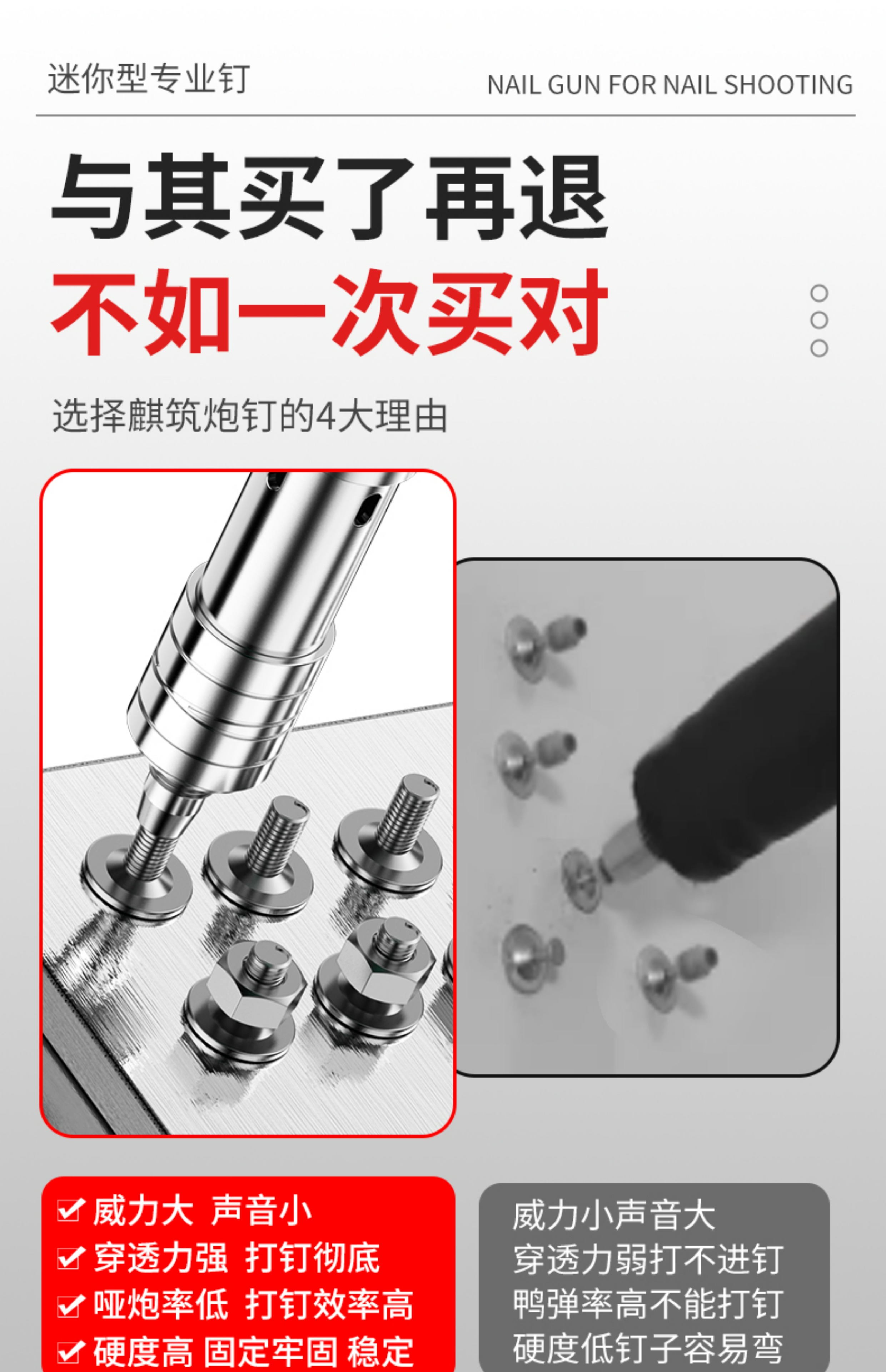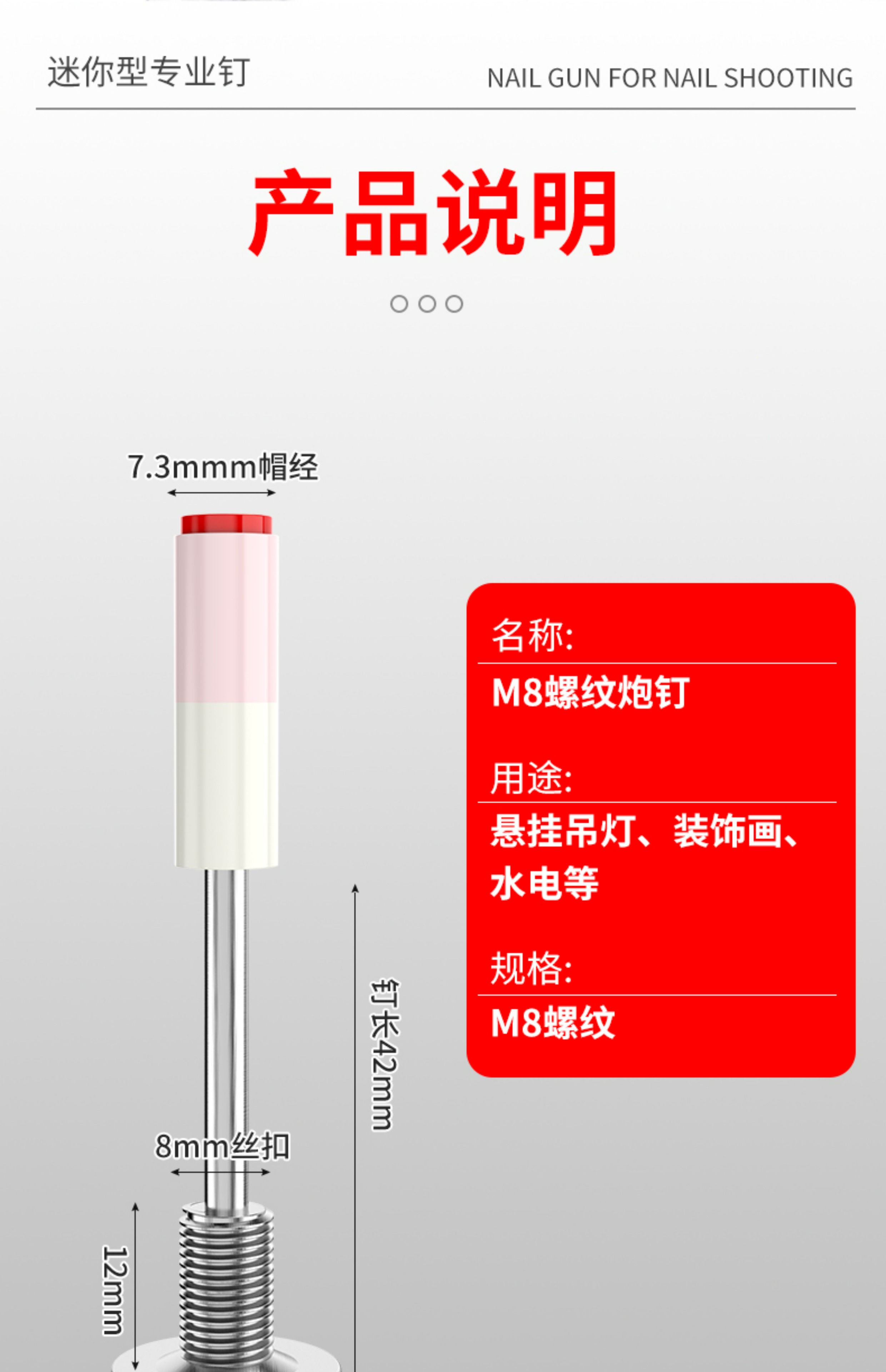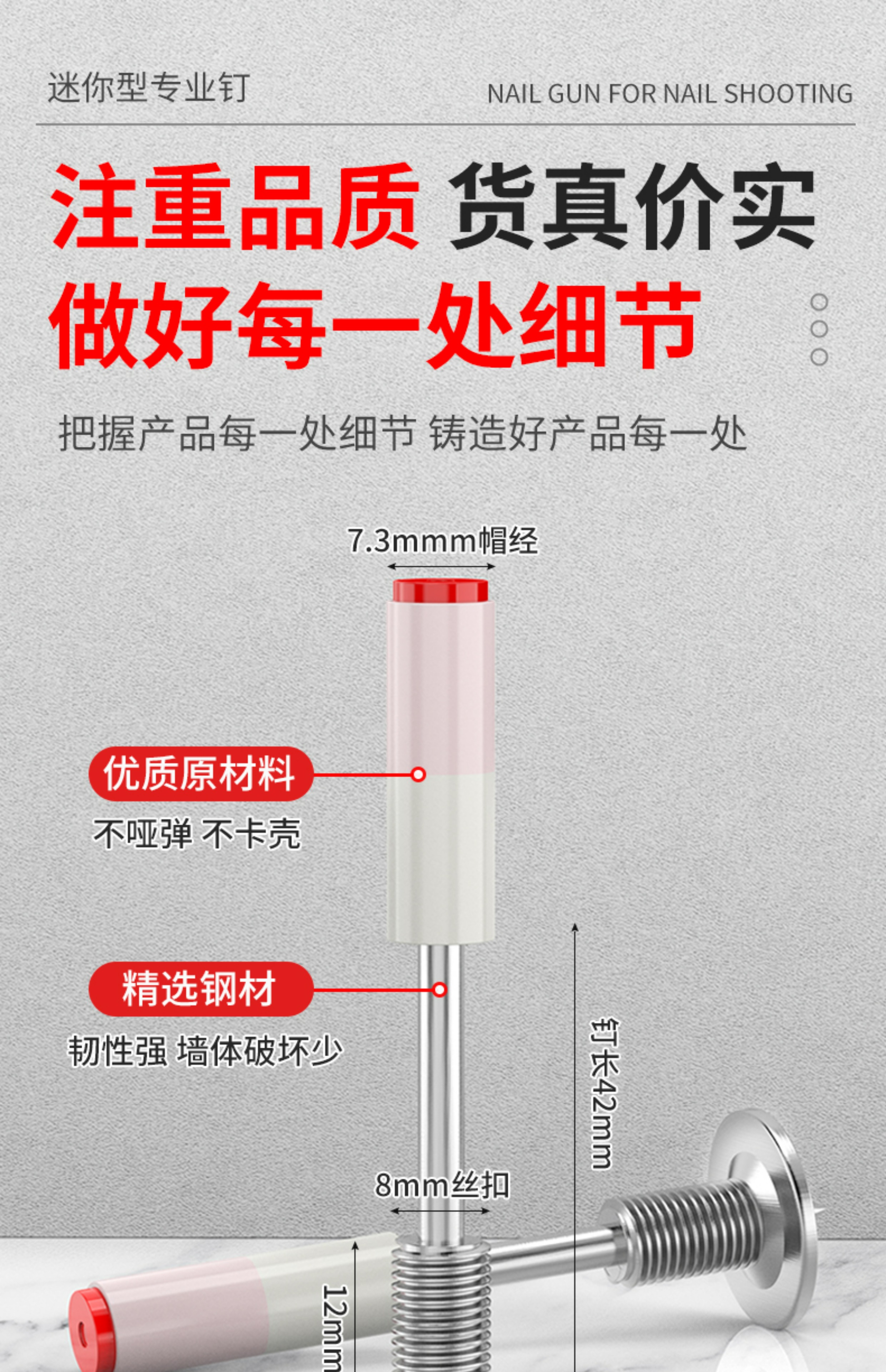 | Modelo | ↓ ↓ ↓ 以下是迷你枪专用钉 ↓ ↓ ↓ ↓ ↓,螺纹一体钉(20颗)配送螺母【升级消音型】,螺纹一体钉(30颗)配送螺母【升级消音型】,螺纹一体钉(50颗)配送螺母【升级消音型】,螺纹一体钉(100颗)配送螺母【升级消音型】,螺纹一体钉(200颗)配送螺母【升级消音型】,加长螺纹一体钉(30颗)配送螺母【升级消音型】,加长螺纹一体钉(50颗)配送螺母【升级消音型】,加长螺纹一体钉(100颗)配送螺母【升级消音型】,加长螺纹一体钉(200颗)配送螺母【升级消音型】,螺纹一体钉(1000颗)配送螺母【升级消音型】,加长螺纹一体钉(1000颗【升级消音型】),螺纹钉30颗+螺母+打钉器【升级消音型】,螺纹钉50颗+螺母+打钉器【升级消音型】,螺纹钉100颗+螺母+打钉器【升级消音型】,迷你消防2000颗(送迷你枪一把【升级消音型】),迷你27消防钉【100颗】【升级消音型】 【小枪专用】,迷你27消防钉【200颗】【升级消音型】 【小枪专用】,迷你消防钉400颗【升级消音型】 【小枪专用】,迷你消防钉1000颗【升级消音型】 【小枪专用】,迷你排卡100颗【升级消音型】,迷你排卡200颗【升级消音型】,迷你16管卡钉【100颗】【升级消音型】 【小枪专用】,迷你16管卡200颗【升级消音型】,迷你16管卡500颗【升级消音型】,迷你20管卡钉【100颗】【升级消音型】 【小枪专用】,迷你20管卡200颗【升级消音型】,迷你20管卡500颗【升级消音型】,迷你25管卡钉【100颗】【升级消音型】 【小枪专用】,迷你25管卡200颗【升级消音型】,迷你25管卡500颗【升级消音型】,迷你排卡1000颗【升级消音型】,迷你16管卡1000颗【升级消音型】,迷你20管卡1000颗【升级消音型】,迷你25管卡1000颗【升级消音型】,迷你32消防100颗【升级消音型】,迷你32消防200颗【升级消音型】,迷你32消防400颗【升级消音型】,迷你42消防100颗【升级消音型】,迷你42消防200颗【升级消音型】,迷你42消防400颗【升级消音型】,↓ ↓ ↓ 以下是大枪专用钉↓ ↓ ↓,32消防钉【100颗】(圆) 【大枪专用】,32消防钉【200颗】(圆) 【大枪专用】,42消防钉【100颗】(圆) 【大枪专用】,42消防钉【200颗】(圆) 【大枪专用】,吊顶钉M8【50颗】 【量大价优】,吊顶钉M6【100颗】 【哑弹包赔】,吊顶钉M8【100颗】 【韧性足不断钉】,吊顶钉M10【100颗】 【量大价优】,16管卡钉【100颗】 【量大价优】,20管卡钉【80颗】 【哑弹包赔】,25管卡钉【80颗】 【韧性足不断钉】,32管卡钉【60颗】 【量大价优】,42消防钉【200颗】(方) 【大枪专用】,32消防钉【200颗】(方) 【大枪专用】,L型木龙骨【50颗】 【韧性足不断钉】,47木龙骨【150颗】 【哑弹包赔】 |