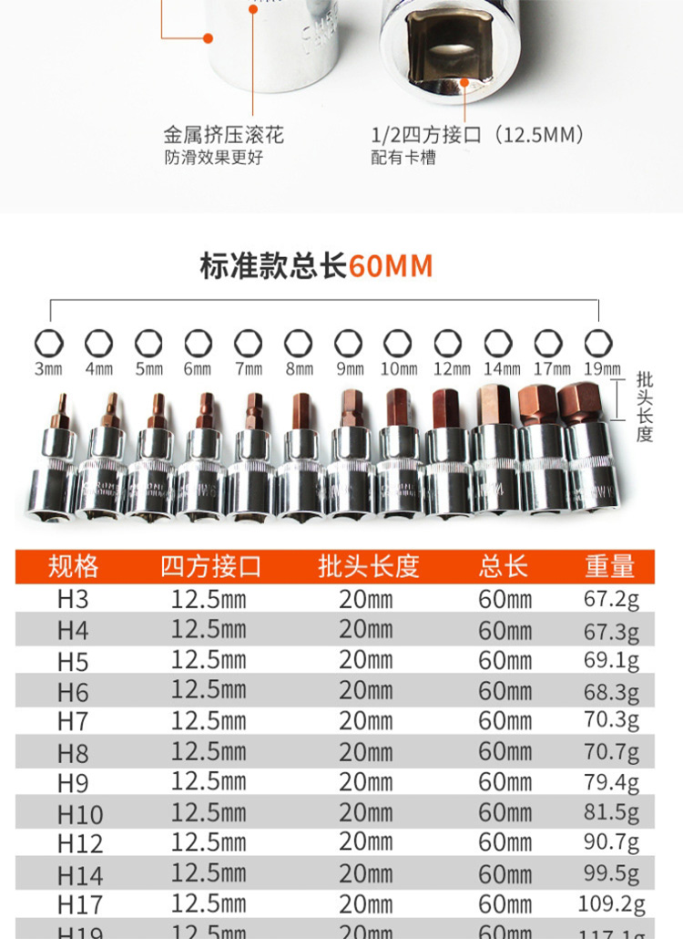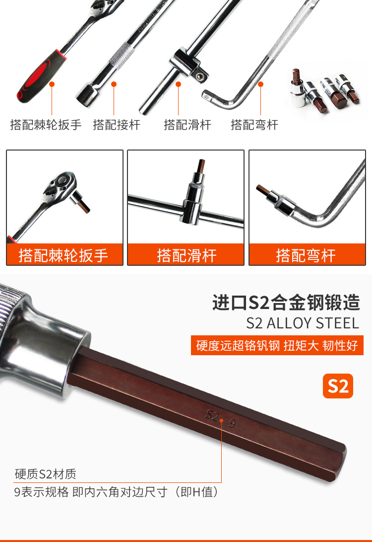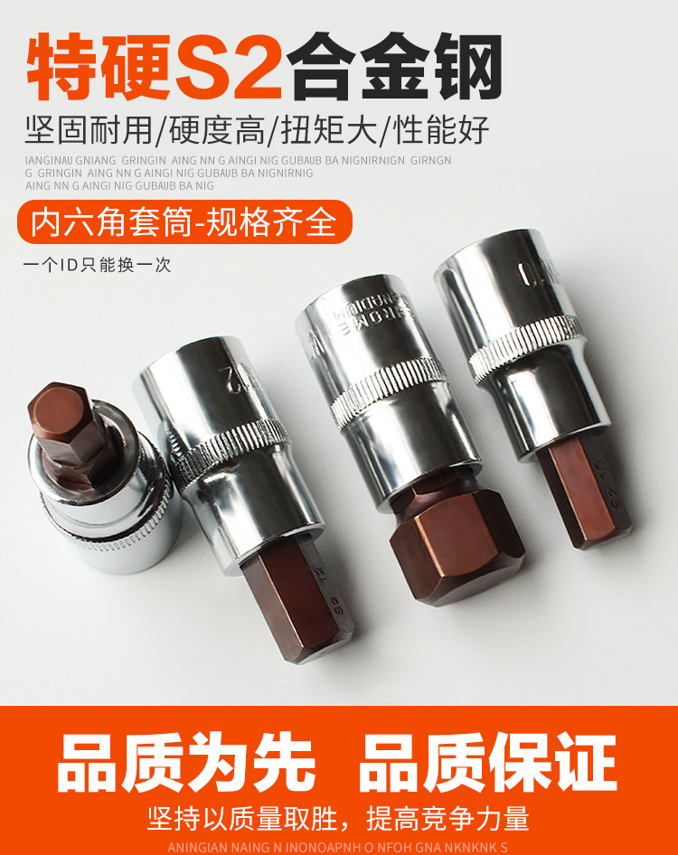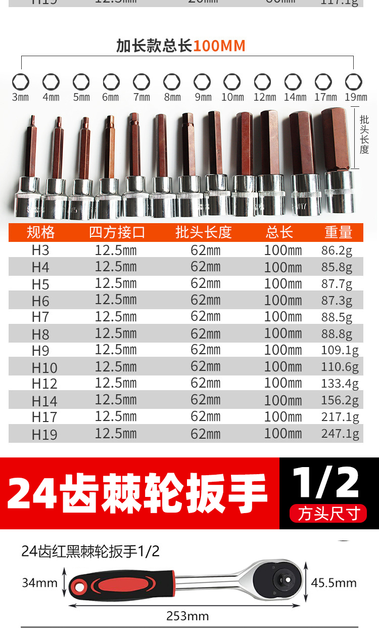 | Especificaciones y modelos | La longitud total de la manga hexagonal de 3 mm es de 60 mm, la longitud total de la manga hexagonal de 4 mm es de 60 mm, la longitud total de la manga hexagonal de 5 mm es de 60 mm, la longitud total de la manga hexagonal de 6 mm es de 60 mm, la longitud total de la manga hexagonal de 7 mm es de 60 mm, la longitud total de la manga hexagonal de 8 mm es de 60 mm, la longitud total de la manga hexagonal de 9 mm es de 60 mm, la longitud total de la manga hexagonal de 10 mm es de 60 mm, la longitud total de la manga hexagonal de 12 mm es de 60 mm, la longitud total de la manga hexagonal de 14 mm es de 60 mm, la longitud total de la manga hexagonal de 19 mm es de 60 mm, la longitud total de 17 mm es de 60 mm, La longitud total de la manga hexagonal interna de 3mm es de 100mm, la longitud total de la manga hexagonal interna de 4mm es de 100mm, la longitud total de la manga hexagonal interna de 5mm es de 100mm, la longitud total de la manga hexagonal interna de 6mm es de 100mm, la longitud total de la manga hexagonal interna de 7mm es de 100mm, la longitud total de la manga hexagonal interna de 8mm es de 100mm, la longitud total de la manga hexagonal interna de 9mm es de 100mm, la longitud total de la manga hexagonal interna de 10mm es de 100mm, la longitud total de la manga hexagonal interna de 12mm es de 100mm, la longitud total de la manga hexagonal interna de 14mm es de 100mm, la longitud total de la manga hexagonal 19mm manguito hexágono hembra longitud total 100mm, 8 piezas (5 6 7 8 9 10 1/2 14mm) longitud total de 60mm, 8 conjuntos (5 6 7 8 9 10 1/2 14mm) longitud total de 100mm, manga hexagonal interna 1/2 conjuntos [H3 - H19 * 60MM], manga hexagonal interna 1/2 conjuntos [H3 - H19 * 100MM], llave de trinquete rojo y negro de 24 dientes 1 / 2, llave de trinquete rojo y azul de 72 dientes 1 / 2, llave deslizante de llave 1 / 2, llave deslizante de llave 1 / 4 |