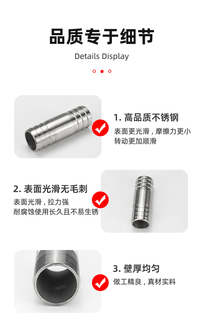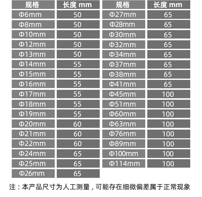 | Modelo de especificación | 304 diámetro exterior 6mm longitud 50mm,304 diámetro exterior 8mm longitud 50mm,304 diámetro exterior 10mm longitud 50mm,304 diámetro exterior 12mm longitud 50mm,304 diámetro exterior 13mm longitud 50mm,304 diámetro exterior 14mm longitud 55mm,304 diámetro exterior 15mm longitud 55mm,304 diámetro exterior 16mm longitud 55mm,304 diámetro exterior 17mm longitud 55mm,304 diámetro exterior 18mm longitud 55mm,304 diámetro exterior 19mm longitud 55mm,304 diámetro exterior 20mm longitud 60mm,304 diámetro exterior 21mm longitud 60mm,304 diámetro exterior 22mm longitud 60mm,304 diámetro exterior 24mm longitud 65mm,304 diámetro exterior 25mm longitud 65mm,304 diámetro exterior 26mm longitud 65mm,304 diámetro exterior 27mm longitud 65mm,304 diámetro exterior 28mm longitud 65mm,304 diámetro exterior 30mm longitud 65mm,304 diámetro exterior 32mm longitud 65mm,304 diámetro exterior 34mm longitud 65mm,304 diámetro exterior 37mm longitud 65mm,304 diámetro exterior 38mm longitud 65mm,304 Diámetro exterior 41mm Largo 65mm,304 diámetro exterior 45mm longitud 80mm,304 diámetro exterior 51mm longitud 80mm,304 diámetro exterior 60mm longitud 100mm,304 diámetro exterior 63mm longitud 100mm,304 diámetro exterior 76mm longitud 100mm,304 diámetro exterior 89mm longitud 100mm,304 diámetro exterior 100mm longitud 100mm,304 diámetro exterior 114mm longitud 100mm |
