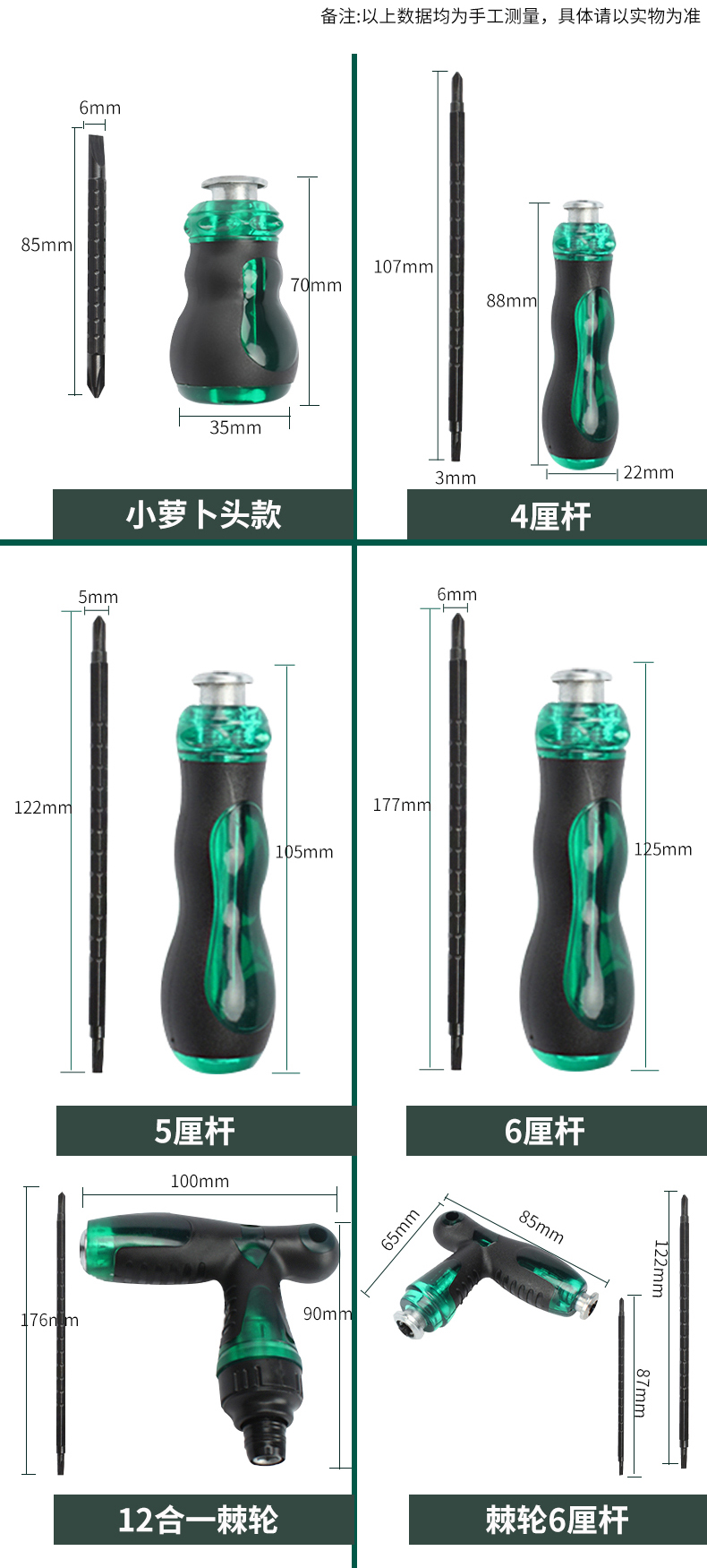 | Especificaciones y modelos | 4厘杆伸缩两用型 颜色随机,5厘杆伸缩两用型 颜色随机,6厘杆伸缩三用型 颜色随机,6厘T型双杆伸缩两用型 颜色随机,6厘杆伸缩两用型 颜色随机,4-6mm定位螺丝刀(6mm长) 颜色随机,小萝卜头可伸缩 颜色随机,T型伸缩杆可伸缩型(棘轮) 颜色随机,4-6mm定位螺丝刀(6mm短) 颜色随机,伸缩两用五件套 颜色随机,玉米柄2寸一字(4*50mm )【2把】,玉米柄2寸十字(4*50mm )【2把】,两寸十字一字各一把,玉米柄3寸一字( 5*75mm )【2把】,玉米柄3寸十字( 5*75mm )【2把】,三寸十字一字各一把,玉米柄4寸一字(6*95mm)【2把】,玉米柄4寸十字(6*95mm )【2把】,四寸十字一字各一把,玉米柄5寸一字(6*125mm )【2把】,玉米柄5寸十字(6*125mm )【2把】,五寸十字一字各一把,玉米柄6寸一字(6*145mm )【2把】,玉米柄6寸十字(6*145mm )【2把】,六寸十字一字各一把,玉米柄8寸一字(6*190mm ),玉米柄8寸十字( 6*190mm ),八寸十字一字各一把,玉米柄一字6把装,玉米柄十字6把装,3寸/4寸/5寸六件套,4寸/5寸/6寸六件套,精品S2(4寸)一字6*100mm,精品S2( 4寸)十字6*100mm,精品S2(5寸)一字6*125mm,精品S2( 5寸)十字6*125mm,精品S2(6寸)一字6*150mm,精品S2(6寸)十字6*150mm,精品S2(8寸)一字6*200mm,精品S2( 8寸)十字6*200mm,精品S2(10寸]一字6*250mm,精品s2( 10寸)十字6*250mm,精品S2( 12寸)一字6*300mm,精品S2( 12寸)十字6*300mm,精品S2 两用4*75mm,精品S2 两用5*100mm,精品S2 两用6*100mm,精品S2伸缩两用6*150mm,敲击十字8*200mm,敲击一字8*200mm,敲击8*200mm 两把装,敲击十字8*250mm,敲击一字8*250mm,敲击8*250mm 两把装 |