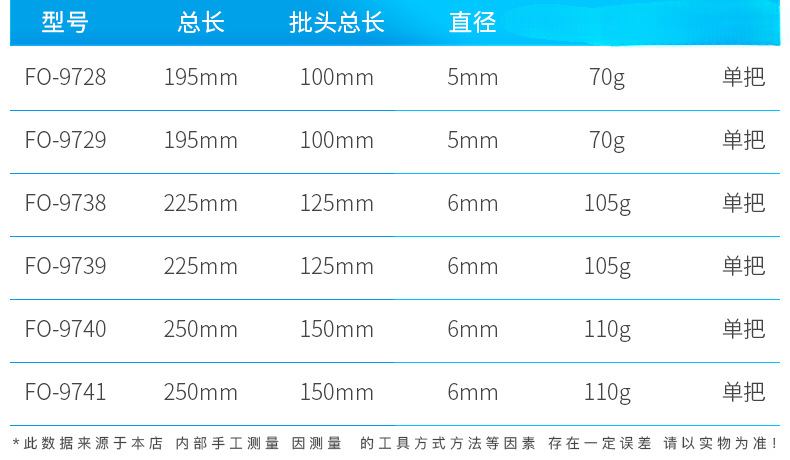 | Especificaciones y modelos | Fo - 9728 [5 * 100 palabra], fo - 9729 [5 * 100 cruz], fo - 9738 [6 * 125 palabra], fo - 9739 [6 * 125 cruz], fo - 9740 [6 * 150 palabra], fo - 9741 [6 * 150 cruz], destornillador especial para electricistas 6 juegos |