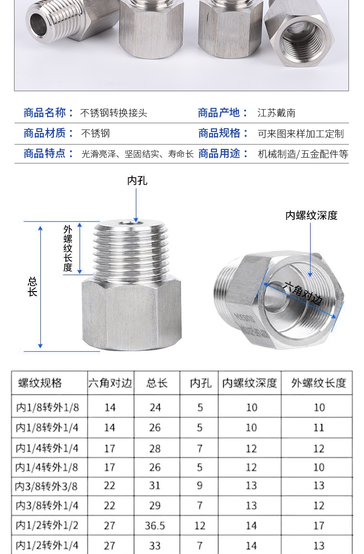| Especificaciones | 内M10*1-外M10*1,内M10*1-外M14*1.5,内M10*1-外1/4(2分),内M14*1.5-外1/8(1分),内M14*1.5-外1/4(2分),内M14*1.5-外3/8(3分),内M14*1.5-外1/2(4分),内M14*1.5-外M10*1,内M14*1.5-外M14*1.5,内M14*1.5-外M20*1.5,内M20*1.5-外1/4(2分),内M20*1.5-外3/8(3分),内M20*1.5-外1/2(4分),内M20*1.5-外3/4(6分),内M20*1.5-外M14*1.5,内M20*1.5-外M20*1.5,内1/8(1分)-外1/8(1分),内1/8(1分)-外1/4(2分),内1/8(1分)外M6*1,内1/8(1分)外M8*1,内1/8(1分)外M10*1,内1/4(2分)-外1/8(1分),内1/4(2分)-外1/4(2分),内1/4(2分)-外3/8(3分),内1/4(2分)-外1/2(4分),内1/4(2分)-外M10*1,内1/4(2分)-外M14*1.5,内1/4(2分)-外M20*1.5,内3/8(3分)-外1/4(2分),内3/8(3分)-外3/8(3分),内3/8(3分)-外1/2(4分),内3/8(3分)-外M20*1.5,内1/2(4分)-外1/4(2分),内1/2(4分)-外3/8(3分),内1/2(4分)-外1/2(4分),内1/2(4分)-外3/4(6分),内1/2(4分)-外M14*1.5,内1/2(4分)-外M20*1.5,内3/4(6分)-外3/8(3分),内3/4(6分)-外1/2(4分),内3/4(6分)-外M20*1.5,内3/4(6分)-外3/4(6分),内3/4(6分)-外1寸,内1寸-外1寸,内1寸-外3/4(6分),内1寸-外1/2(4分),内22*1.5外3/8(3分),内22*1.5外1/2(4分),内1/4NPT转外G1/4 |