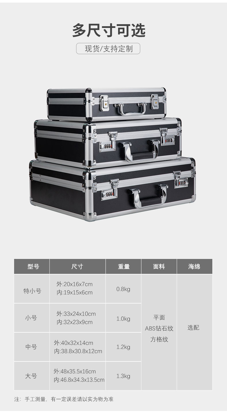 | Modelo de especificación | Caja vacía plateada pequeña en ángulo recto A-005 30*20*8,5 cm Tamaño interior 29*19*7,5 cm,Esponja de plata de ángulo recto pequeño A-005 más algodón a cuadros 30*20*8,5 cm tamaño interior 29*19*7,5 cm,A-005 pequeño en ángulo recto negro vacío 30*20*8,5 cm tamaño interior 29*19*7,5 cm,A-005 pequeño ángulo recto negro más algodón celosía mar 30*20*8,5 cm tamaño interior 29*19*7,5 cm,Caja vacía de bloqueo de contraseña de patrón de diamante plateado redondeado pequeño A-009 33*24*10cm tamaño interior 31,8*22,8*8,5 cm,A-009 pequeño patrón de diamante plateado redondeado bloqueo de contraseña más esponja de celosía 33*24*10cm tamaño interior 32*23*9cm,Caja vacía de bloqueo de contraseña con patrón de diamante negro redondeado pequeño A-009 33*24*10cm Tamaño interior 31,8*22,8*8,5 cm,A-009 pequeña esquina redonda patrón de diamante negro bloqueo de contraseña más esponja de celosía 33*24*10cm tamaño interior 32*23*9cm,A-011 plata diamante patrón llave cerradura caja vacía tamaño interior 33.8*23.8*10.5cm,A-011 plata diamante patrón llave herramienta cerradura plus celosía esponja tamaño interior 33.8*23.8*10.5cm,A-011 patrón de diamante plateado código de bloqueo caja vacía tamaño interior 33.8*23.8*10.5cm,Bloqueo de contraseña de patrón de diamante plateado A-011 más esponja a cuadros tamaño interior 33.8*23.8*10.5cm,A-011 negro patrón de diamante llave cerradura de herramienta caja vacía tamaño interior 33,8*23,8*10,5 cm,A-011 negro patrón de diamante llave herramienta cerradura plus celosía esponja tamaño interior 33.8*23.8*10.5cm,A-011 negro patrón de diamante código de bloqueo caja vacía tamaño interior 33.8*23.8*10.5cm,Bloqueo de contraseña de patrón de diamante negro A-011 más esponja a cuadros tamaño interior 33.8*23.8*10.5cm,A-012 plata diamante patrón llave cerradura caja vacía tamaño interior 37,3*26,3*11,5 cm,A-012 plata diamante patrón llave cerradura de herramienta más esponja de celosía tamaño interior 37,3*26,3*11,5 cm,A-012 patrón de diamante plateado código de bloqueo caja vacía tamaño interior 37,3*26,3*11,5 cm,Bloqueo de contraseña de patrón de diamante plateado A-012 más esponja de celosía tamaño interior 37,3*26,3*11,5 cm,A-012 negro patrón de diamante llave cerradura de herramienta caja vacía tamaño interior 37,3*26,3*11,5 cm,012 patrón de diamante negro llave cerradura de herramienta más esponja de celosía tamaño interior 37,3*26,3*11,5 cm,A-012 negro patrón de diamante código de bloqueo caja vacía tamaño interior 37,3*26,3*11,5 cm,012 patrón de diamante negro cerradura de combinación de llave más esponja de celosía tamaño interior 37,3*26,3*11,5 cm,A-020 medio redondeado negro cerradura de herramientas caja vacía 40*32*14cm A-020 tamaño interior 38,8*30,8*12cm,A-020 medio redondeado negro cerradura de herramienta más esponja a cuadros 40*32*14cm A-020 tamaño interior 38,8*30,8*12,Caja vacía de bloqueo de contraseña negra redondeada mediana de A-020 40*32*14cm A-020 tamaño interior 38,8*30,8*12cm,A-020 medio redondeado bloqueo de contraseña negro más esponja a cuadros 40*32*14cm A-020 tamaño interior 38,8*30,8*12,A-021 plata diamante patrón llave cerradura caja vacía tamaño interior 40,8*31,3*13cm,A-021 plata diamante patrón llave herramienta cerradura plus celosía esponja tamaño interior 40,8*31,3*13cm,A-021 patrón de diamante plateado código de bloqueo caja vacía tamaño 40,8*31,3*13cm,Bloqueo de contraseña de patrón de diamante plateado A-021 más esponja de celosía tamaño interior 40,8*31,3*13cm,A-021 negro patrón de diamante llave cerradura de herramienta caja vacía tamaño interior 40,8*31,3*13cm,A-021 negro patrón de diamante llave herramienta cerradura plus celosía esponja tamaño interior 40,8*31,3*13cm,A-021 negro patrón de diamante código de bloqueo caja vacía tamaño 40,8*31,3*13cm,Bloqueo de contraseña de patrón de diamante negro A-021 más esponja a cuadros tamaño interior 40,8*31,3*13cm,A-022 plata diamante patrón llave cerradura caja vacía tamaño interior 43,8*32,3*13cm,A-022 plata diamante patrón llave herramienta cerradura plus celosía esponja tamaño interior 43,8*32,3*13cm,Bloqueo de contraseña de patrón de diamante plateado A-022, tamaño interior de la caja vacía 43.8*32.3*13cm,Bloqueo de contraseña de patrón de diamante plateado A-022 más esponja a cuadros Tamaño interior 43.8*32.3*13cm,A-022 negro patrón de diamante llave cerradura de herramienta caja vacía tamaño interior 43,8*32,3*13cm,A-022 negro patrón de diamante llave herramienta cerradura plus celosía esponja tamaño interior 43,8*32,3*13cm,A-022 negro patrón de diamante código de bloqueo caja vacía tamaño interior 43.8*32.3*13cm,Bloqueo de contraseña de patrón de diamante negro A-022 más esponja a cuadros Tamaño interior 43.8*32.3*13cm,Caja vacía con cerradura de herramienta negra de esquina redonda grande A-023 48*35,5*16cm tamaño interior A-023 46,8*34,3 * 14c,Cerradura de herramienta negra de esquina redonda grande A-023 más esponja a cuadros 48*35,5*16cm A-023 tamaño interior 46,8*34,3 *,Caja vacía de bloqueo de contraseña negra de esquina redonda grande A-023 48*35,5*16cm tamaño interior A-023 46,8*34,3 * 14c,A-023 gran filete negro con bloqueo de contraseña más esponja a cuadros 48*35,5*16cm A-023 tamaño interior 46,8*34,3 *,A-025 plata diamante patrón llave cerradura caja vacía tamaño interior 51,8*35,3*15cm,A-025 plata diamante patrón llave herramienta cerradura plus celosía esponja tamaño interior 51,8*35,3*15cm,A-025 patrón de diamante plateado código de bloqueo caja vacía tamaño 51,8*35,3*15cm,Bloqueo de contraseña de patrón de diamante plateado A-025 más esponja a cuadros tamaño interior 51,8*35,3*15cm,A-025 negro patrón de diamante llave cerradura de herramienta caja vacía tamaño interior 51,8*35,3*15cm,A-025 negro patrón de diamante llave herramienta cerradura
