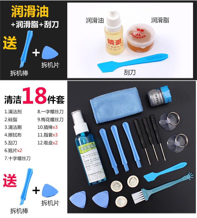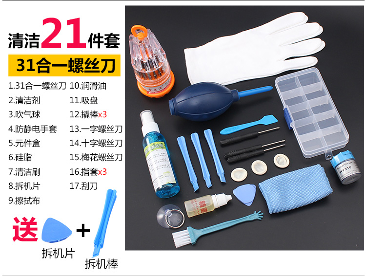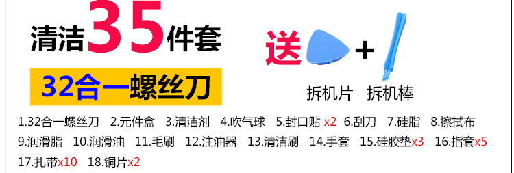 | Modelo de especificación | Juego de 6 piezas de grasa de silicona (2 regalos gratis),Kit de limpieza de pantalla LCD [2 regalos gratis],Raspador de grasa lubricante [2 regalos gratis],Juego de limpieza de 18 piezas [2 regalos gratis],Juego de 21 piezas (destornillador 31 en 1) 2 regalos gratis,Juego de 32 piezas [con soplado de cuero] 2 regalos gratis,Juego de 35 piezas [destornillador 32 en 1] 2 regalos gratis |