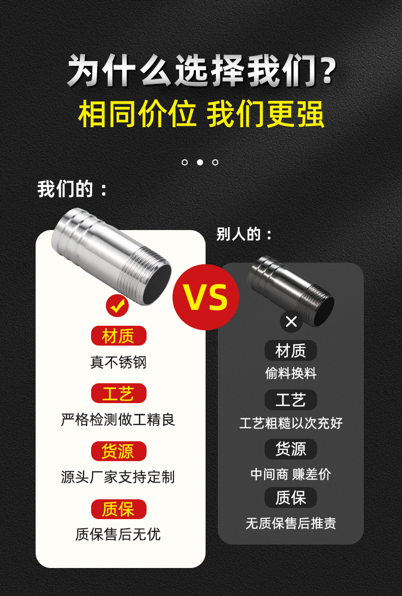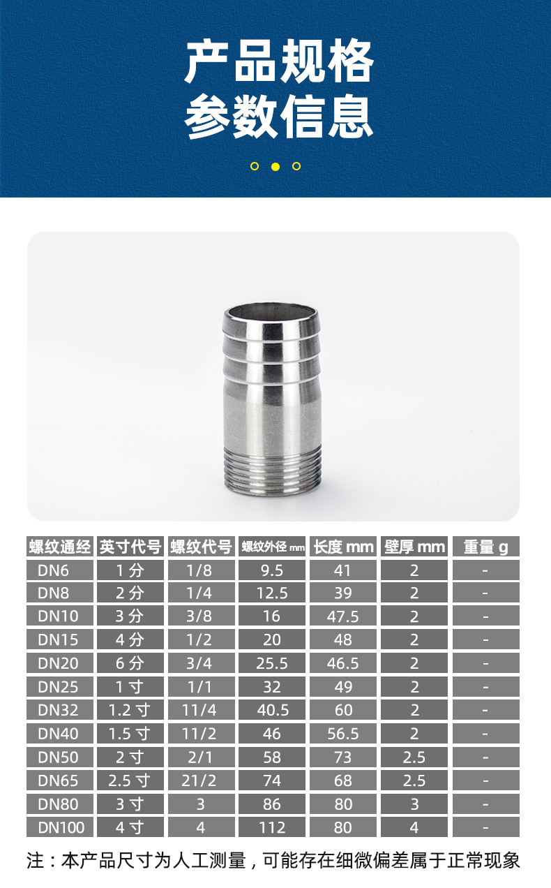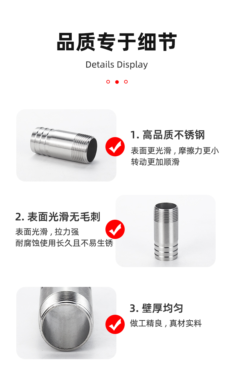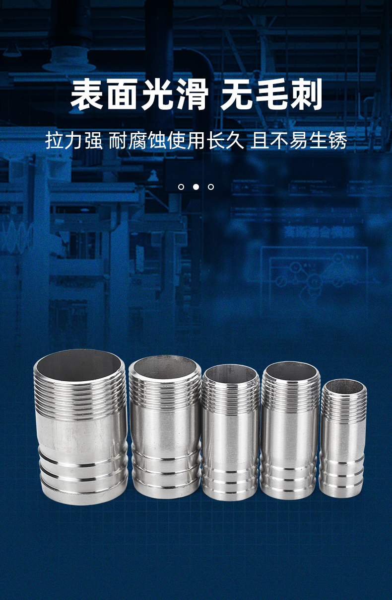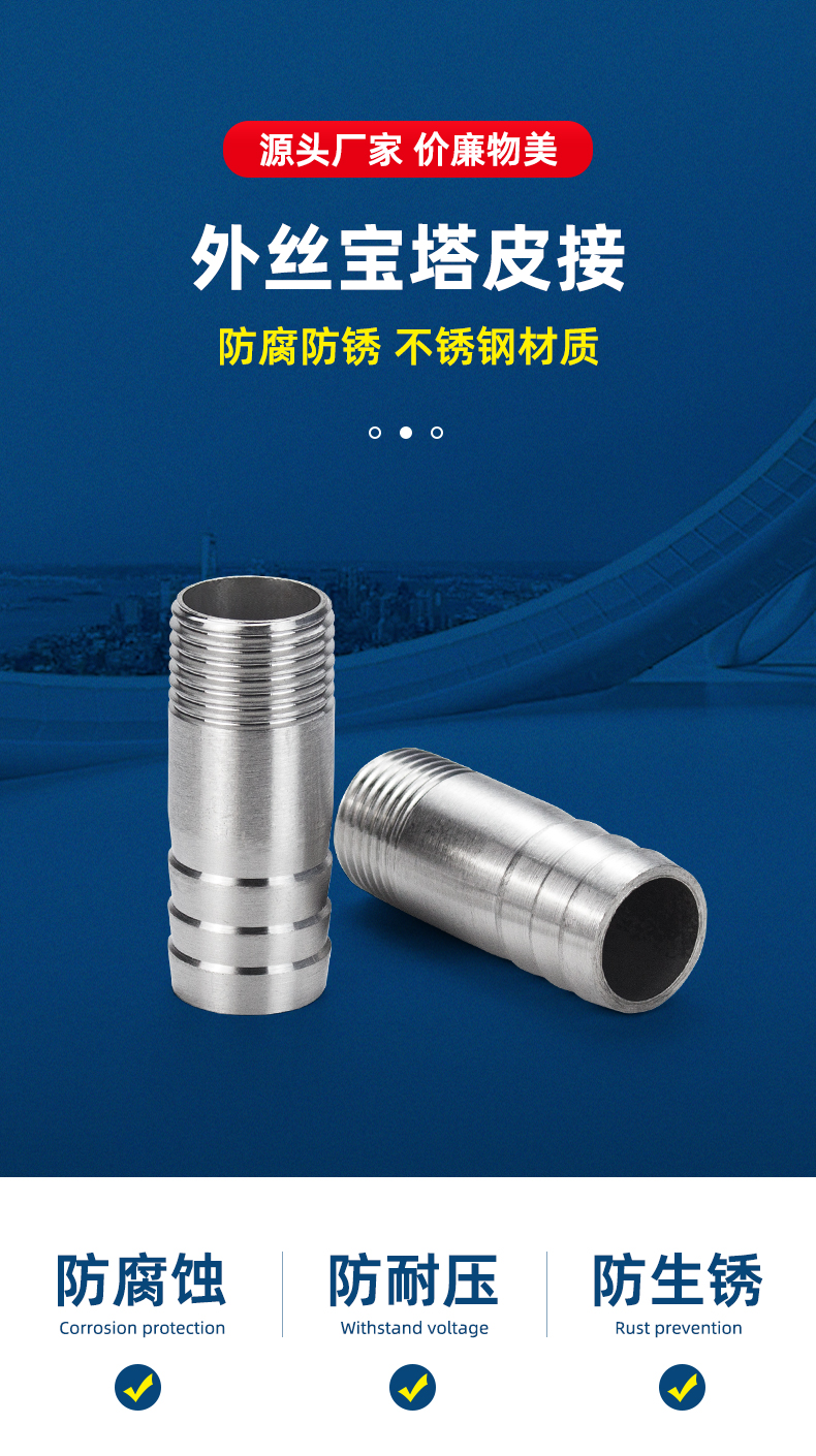 | Especificaciones y modelos | 【304】外丝皮接DN6 (1分),【304】外丝皮接DN8 (2分),【304】外丝皮接DN10 (3分),【304】外丝皮接DN15 (4分),【304】外丝皮接DN20 (6分),【304】外丝皮接DN25 (1寸),【304】外丝皮接DN32 (1.2寸),【304】外丝皮接DN40 (1.5寸),【304】外丝皮接DN50 (2寸),【304】外丝皮接DN65 (2.5寸),【304】外丝皮接DN80 (3寸),【304】外丝皮接DN100 (4寸),【201】外丝皮接DN8 (2分),【201】外丝皮接DN10 (3分),【201】外丝皮接DN15 (4分),【201】外丝皮接DN20 (6分),【201】外丝皮接DN25 (1寸),【201】外丝皮接DN32 (1.2寸),【201】外丝皮接DN40 (1.5寸),【201】外丝皮接DN50 (2寸),【201】外丝皮接DN65 (2.5寸),【201】外丝皮接DN80 (3寸),【201】外丝皮接DN100 (4寸),【316】外丝皮接DN6(1分),【316】外丝皮接DN8(2分),【316】外丝皮接DN10(3分),【316】外丝皮接DN15(4分),【316】外丝皮接DN20(6分),【316】外丝皮接DN25(1寸),【316】外丝皮接DN32(1.2寸,【316】外丝皮接DN40(1.5寸,【316】外丝皮接DN50(2寸),【316】外丝皮接DN65(2.5寸,【316】外丝皮接DN80(3寸),【316】外丝皮接DN100(4寸),→→→→→→→→→【以下为304材质10CM长度】←←←←←←←←←,304材质DN15*100mm 4分,304材质DN20*100mm 6分,304材质DN25*100mm 1寸,304材质DN32*100mm 1.2寸,304材质DN40*100mm 1.5寸,304材质DN50*100mm 2寸,304材质DN65*100mm 2.5寸,304材质DN80*100mm 3寸,304材质DN100*100mm 4寸,→→→→→→→→→【以下为304材质15CM长度】←←←←←←←←←,304材质DN15*150mm 4分,304材质DN20*150mm 6分,304材质DN25*150mm 1寸,304材质DN32*150mm 1.2寸,304材质DN40*150mm 1.5寸,304材质DN50*150mm 2寸,304材质DN65*150mm 2.5寸,304材质DN80*150mm 3寸,304材质DN100*150mm 4寸 |
