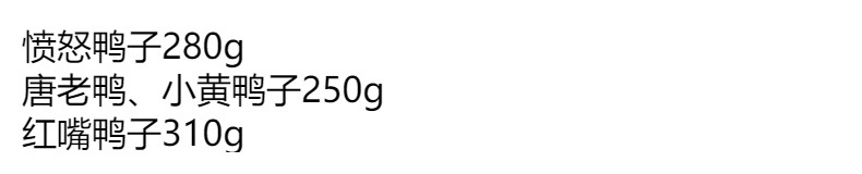 | Modelado | Pato enojado amarillo,Pato enojado púrpura,Pato rojo enojado,Pato enojado verde,Pato Donald Blanco,Pequeño pato amarillo,Pato boca roja |