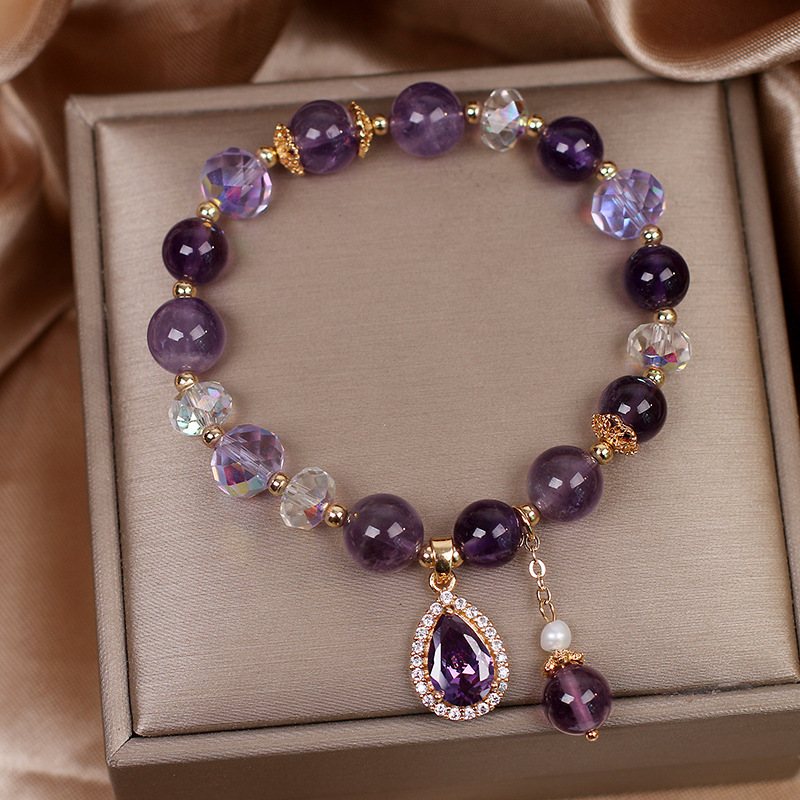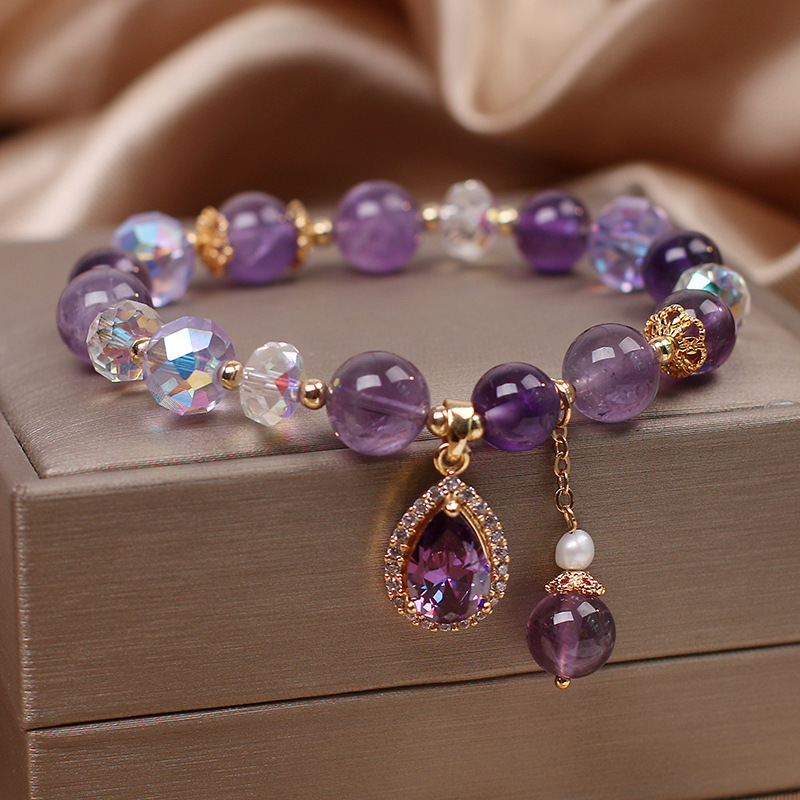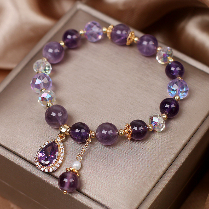Pulsera de amatista natural al por mayor nicho de mujer lujoso delicado joyería de cuatro hojas colgante pulseras de cristal púrpura